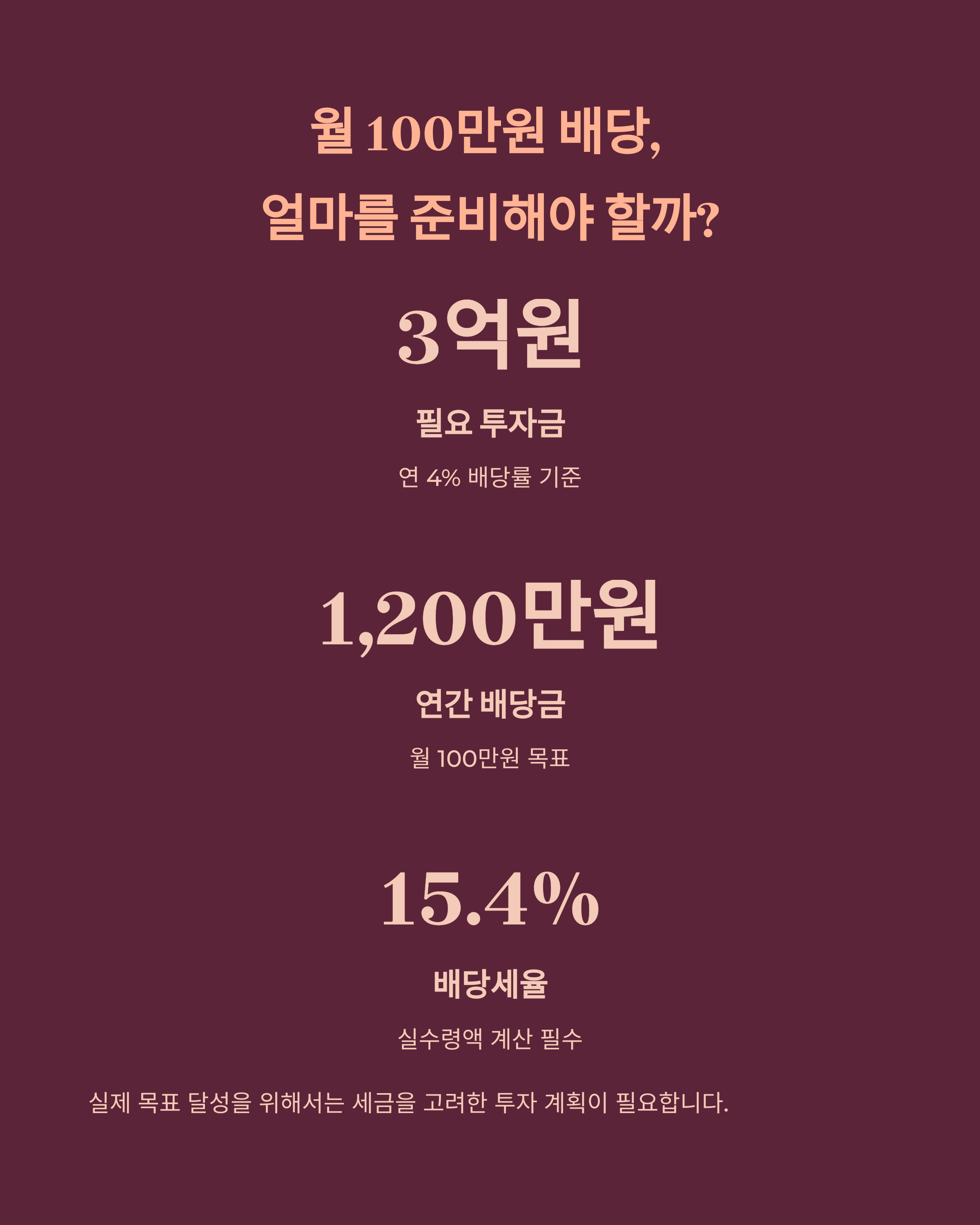 | 월 100만원 | 연간 1,200만원 확보, 약 4~5% 배당률 기준 |