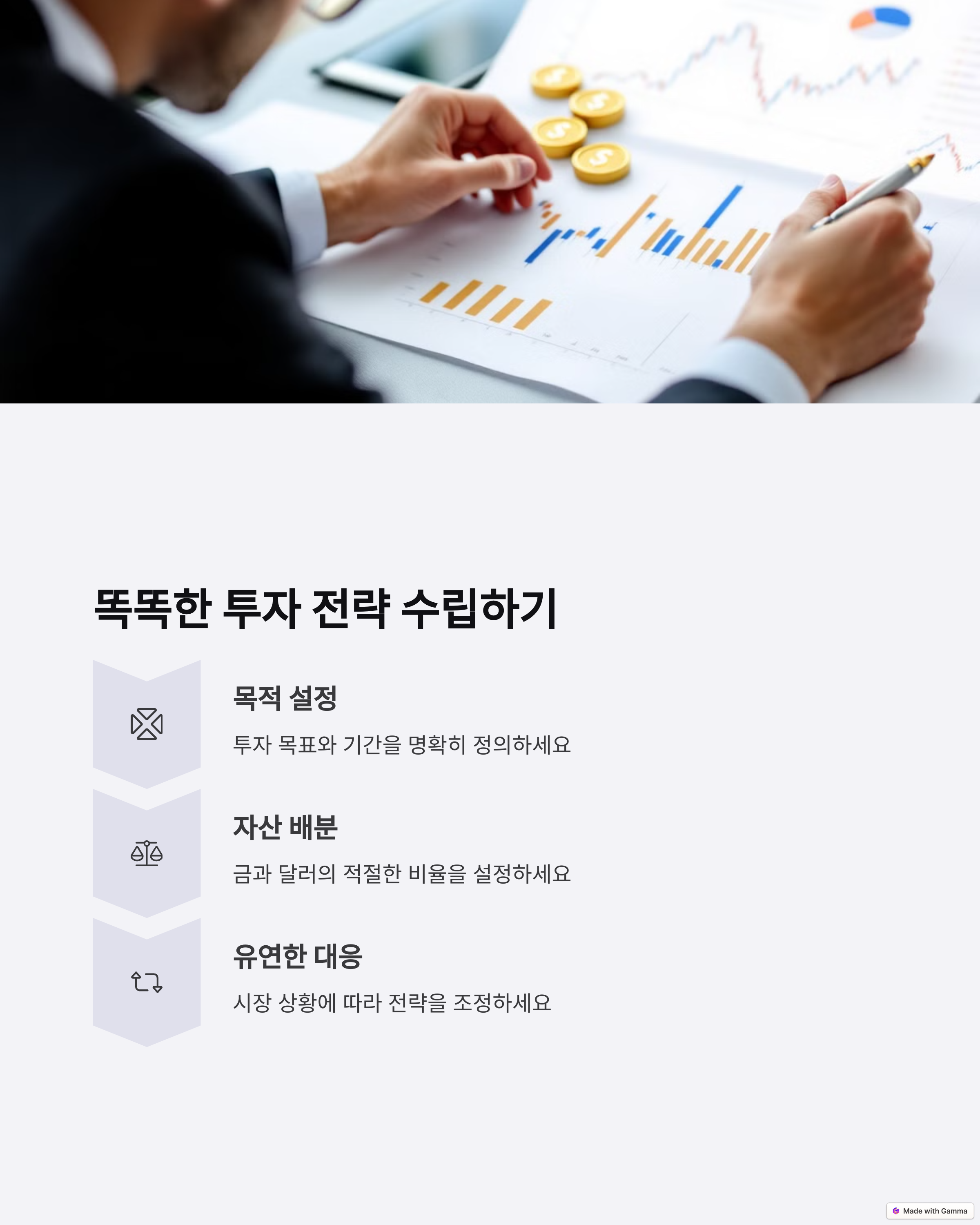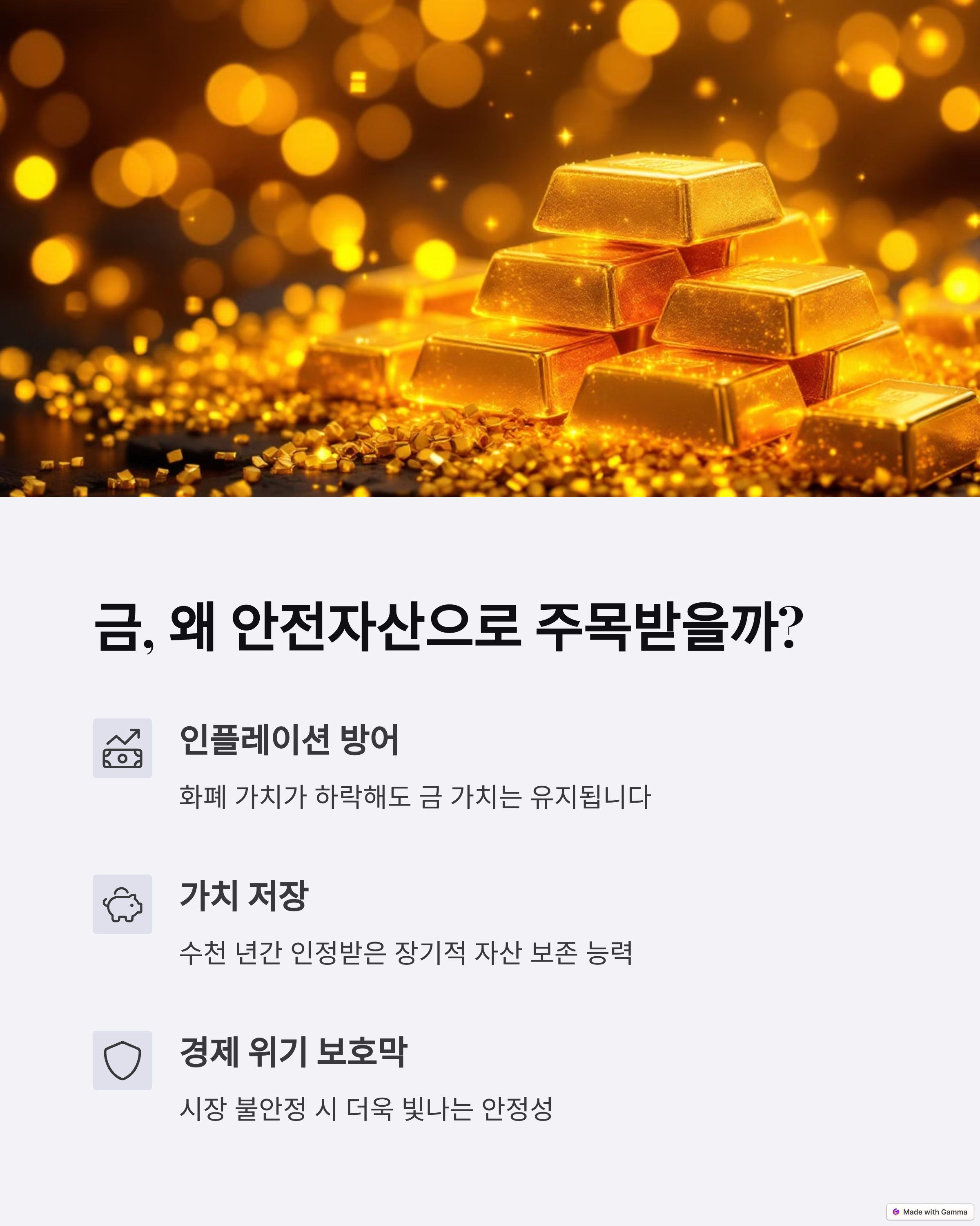 | 금 투자 장점 | 인플레이션 대비 효과와 실물 자산의 안정성 |