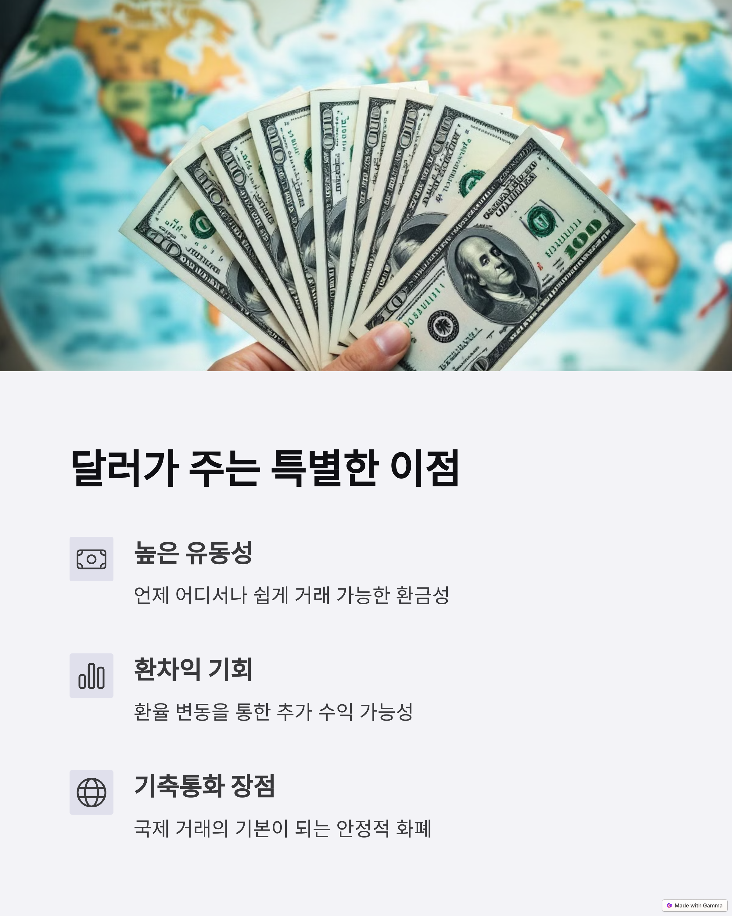 | 달러 자산 장점 | 글로벌 통화로서의 유동성과 환차익 기대감 |