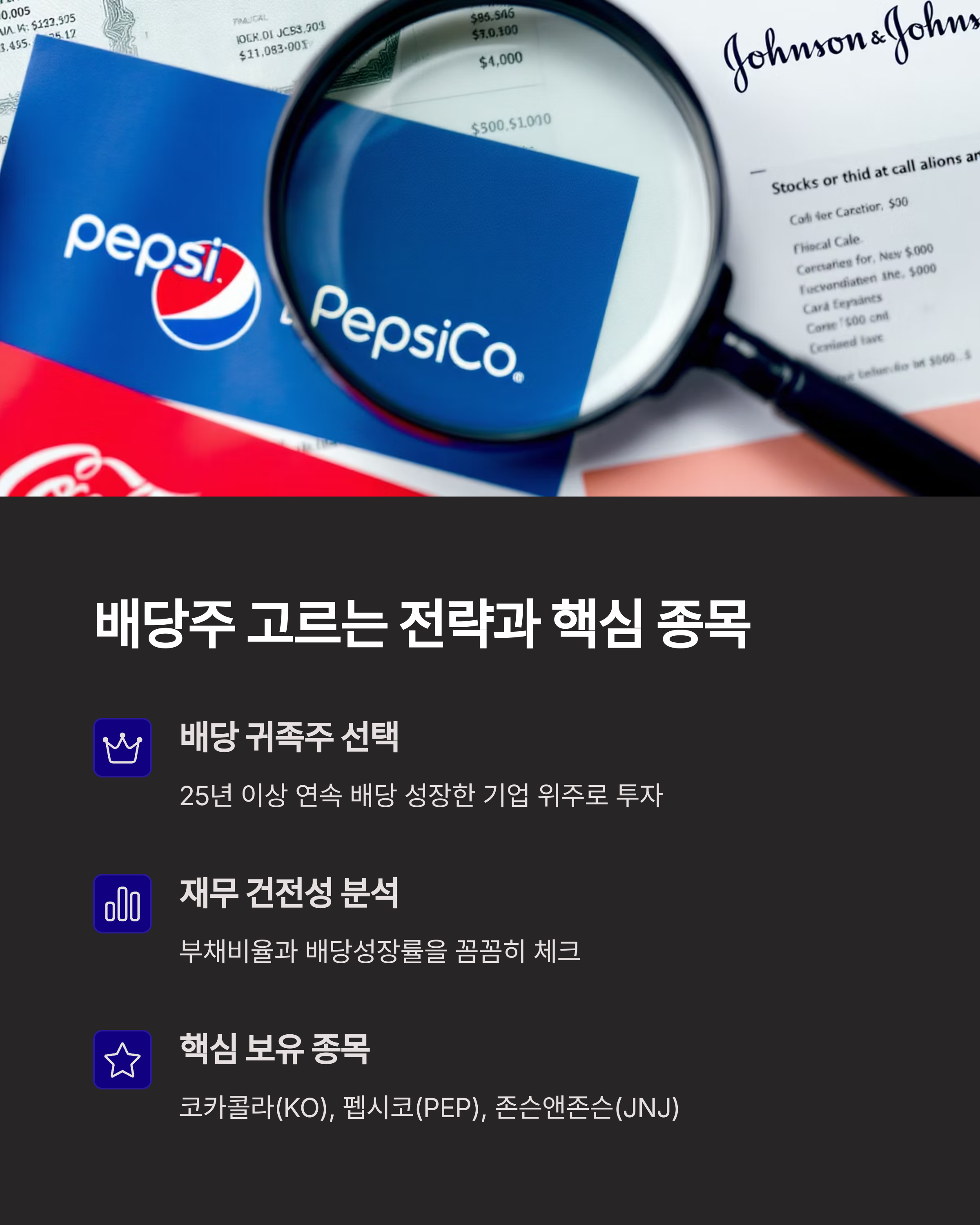 | 연간 약 760만 원의 배당수익을 달성했습니다. | 월별 분할 매수와 장기보유 전략을 병행했습니다. | KO, PEP, JNJ 등 미국 대표 우량 배당주 |