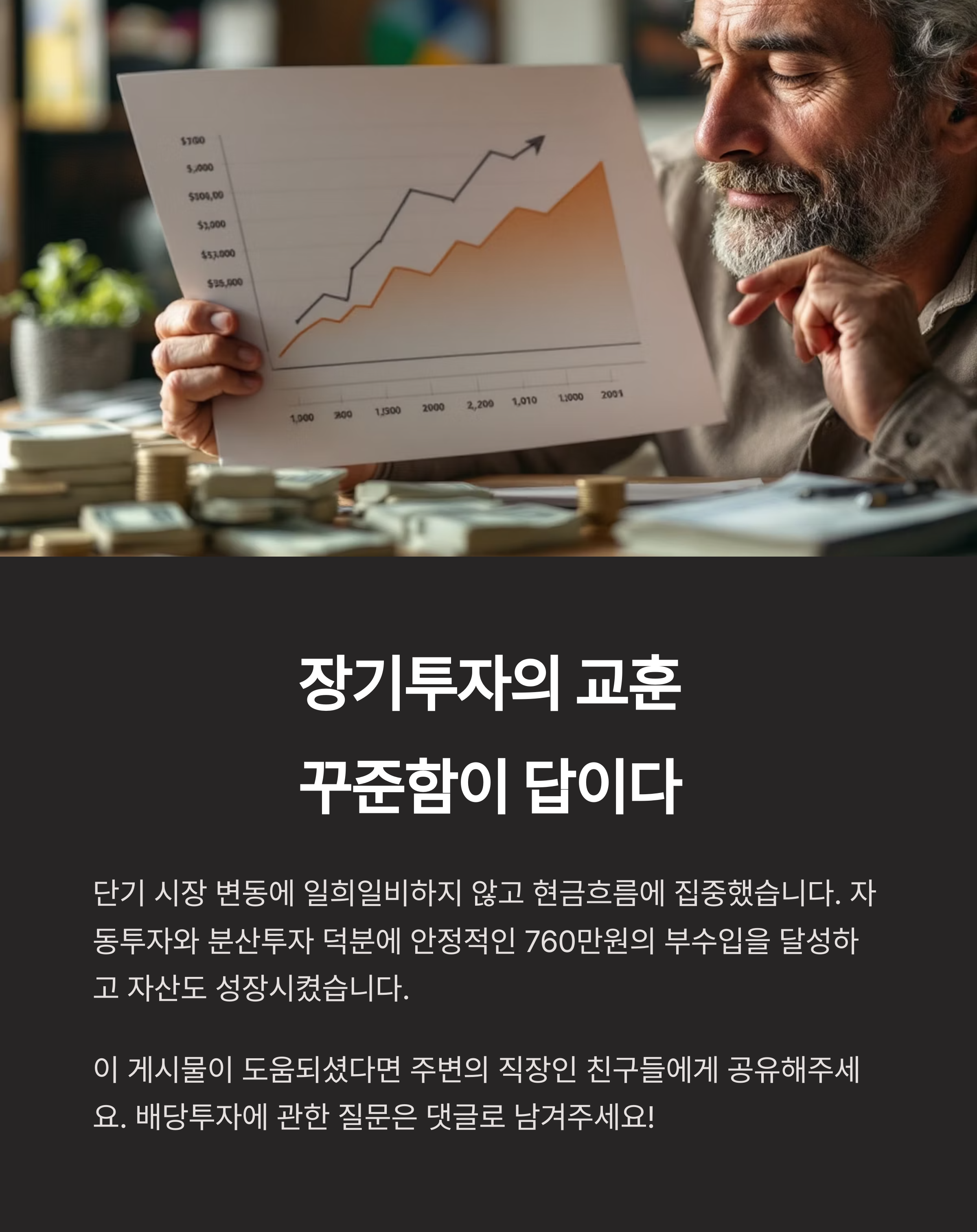 배당투자에서 중요한 것은 단기 수익보다 일관성과 분산입니다. 수익률을 높이기 위한 무리한 종목 선택보다는 꾸준히 배당을 지급하는 기업에 정기적으로 투자하는 것이 결국 높은 복리 효과를 가져왔습니다. 특히 직장인이기 때문에 시간을 효율적으로 쓰기 위해 ETF와 우량 배당주 위주로 포트폴리오를 구성했고, 이 방식이 생활과의 균형에서도 매우 유리했습니다.