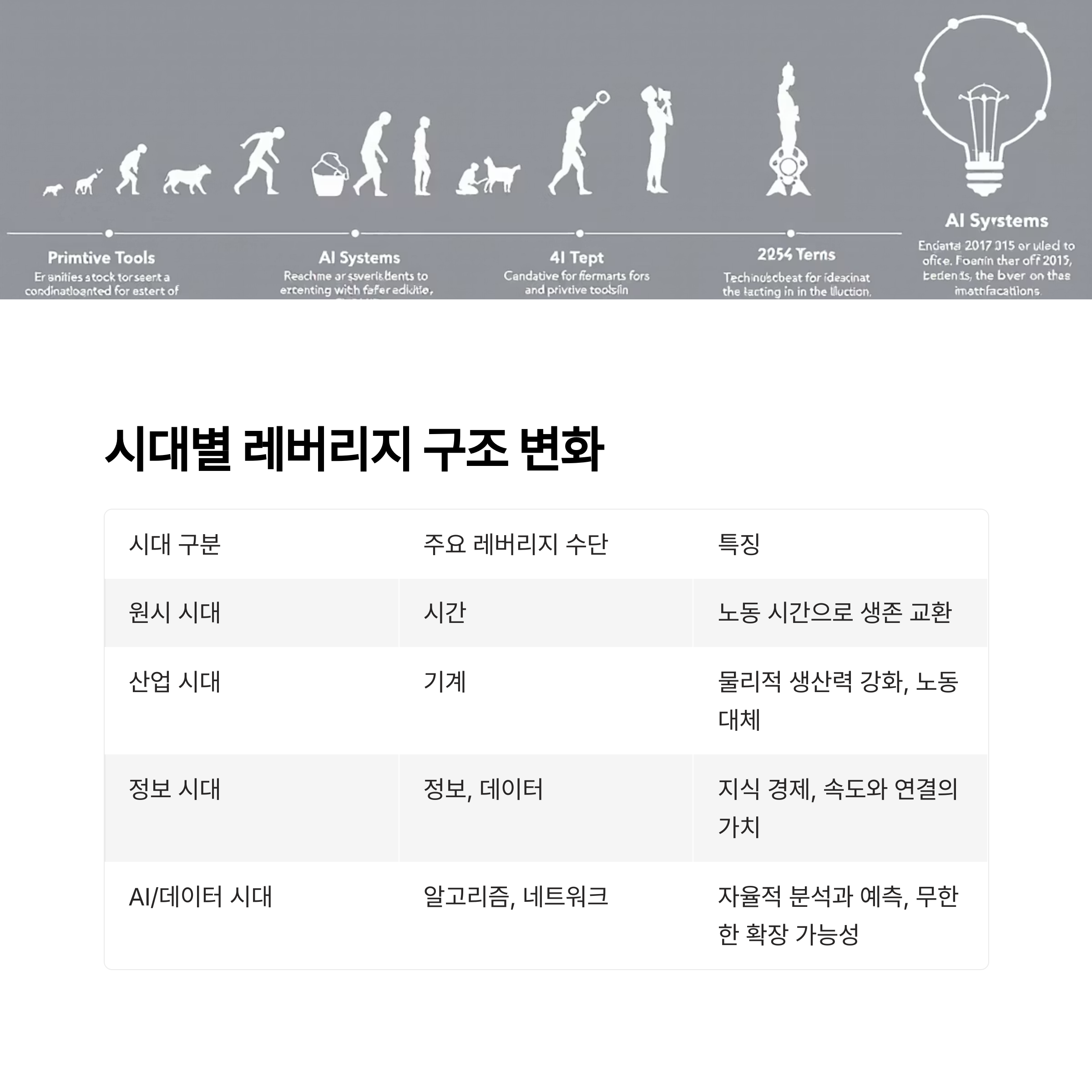 | AI/데이터 시대 | 알고리즘, 네트워크 | 자율적 분석과 예측, 무한한 확장 가능성 |