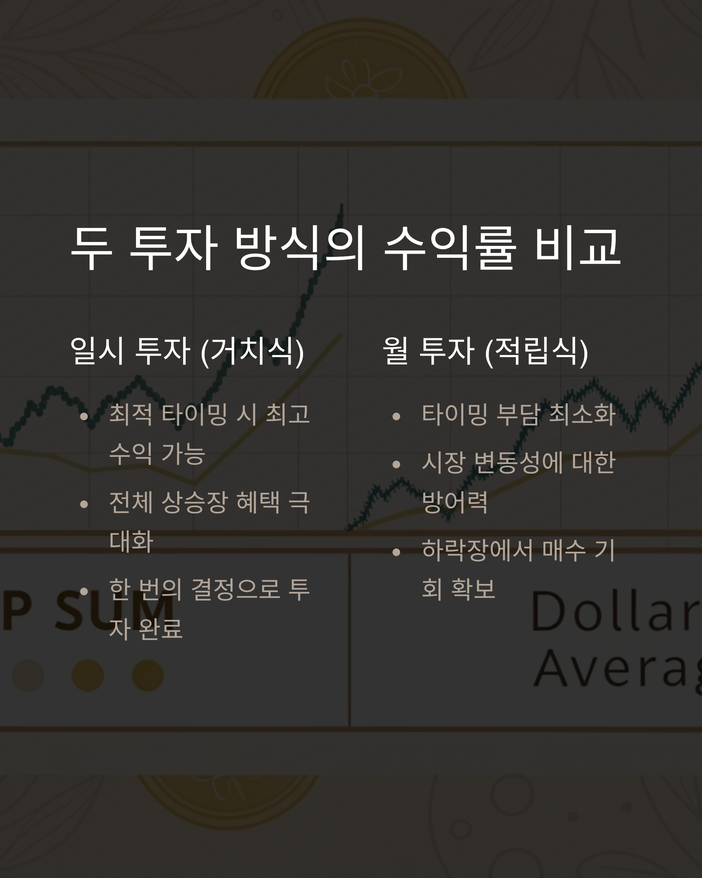 분할 투자는 수익률이 다소 낮을 수 있으나, 심리적 부담이 적고 꾸준히 자산을 키울 수 있습니다.