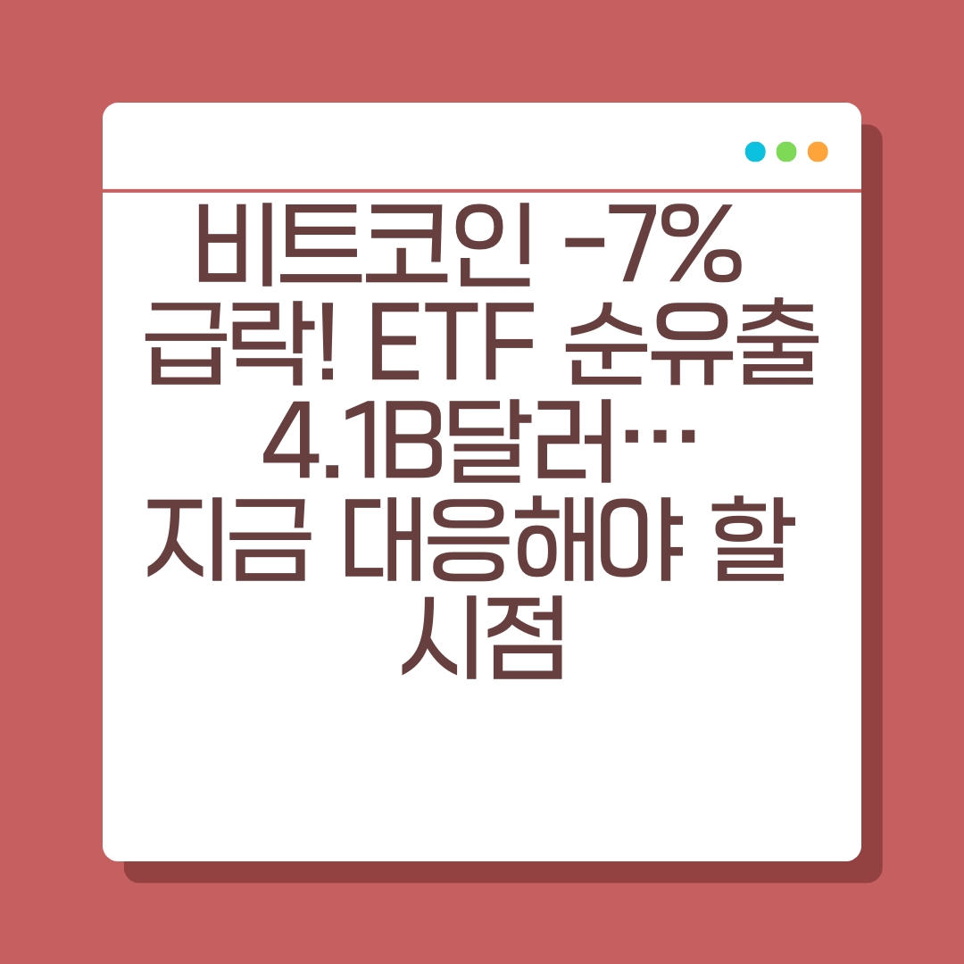 최근 비트코인이 하루 만에 -7% 이상 하락하며 시장에 충격을 주고 있습니다. ETF에서 약 4.1B 달러 규모가 순유출되면서 투자심리가 급랭한 상황인데요. 이러한 하락장이 단기적인 조정일지, 아니면 중장기 하락의 시작인지 다양한 지표와 차트를 기반으로 분석해 보겠습니다. 실시간 차트와 함께 투자자들이 지금 해야 할 행동 전략도 함께 소개드립니다.
