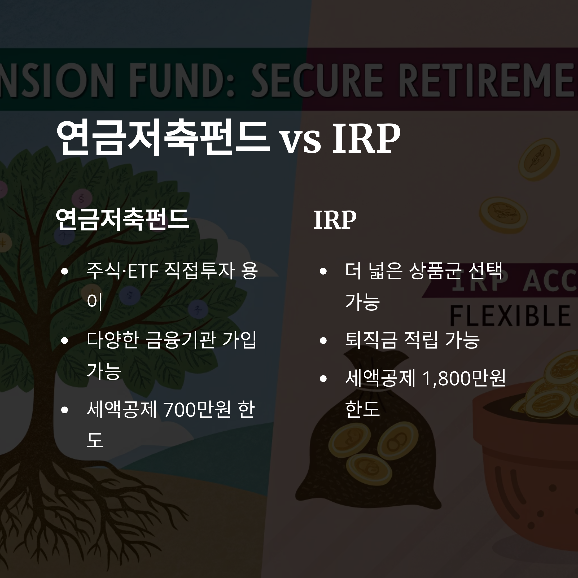 연금저축펀드는 개인 단독 상품, IRP는 퇴직연금 포함 가능이 가장 큰 차이점입니다