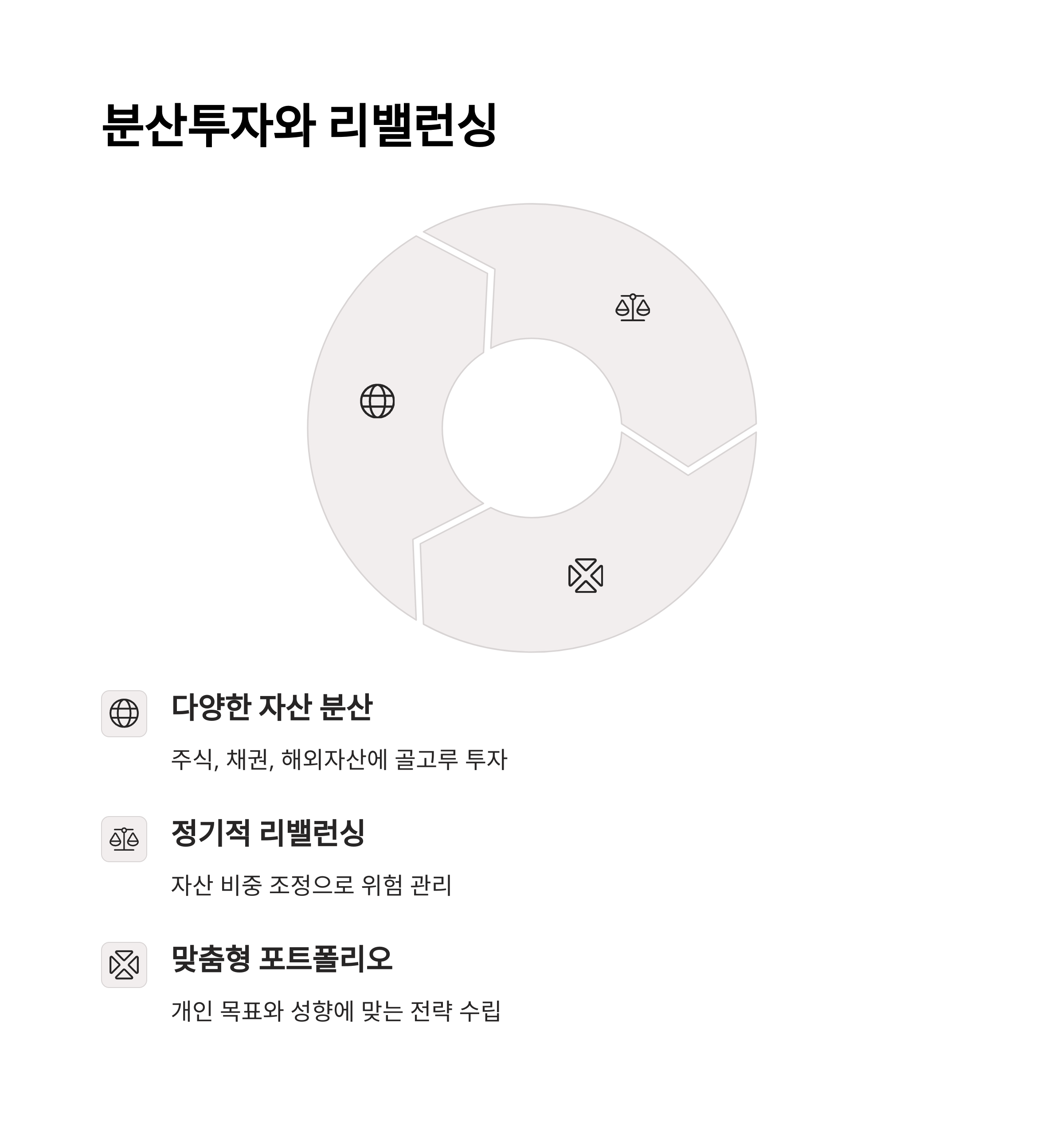 자산을 한 곳에 집중하면 리스크가 커집니다. 국내외 주식형, 채권형, 혼합형 펀드를 조합해 주세요 - 둘째, 정기적인 리밸런싱이 중요합니다