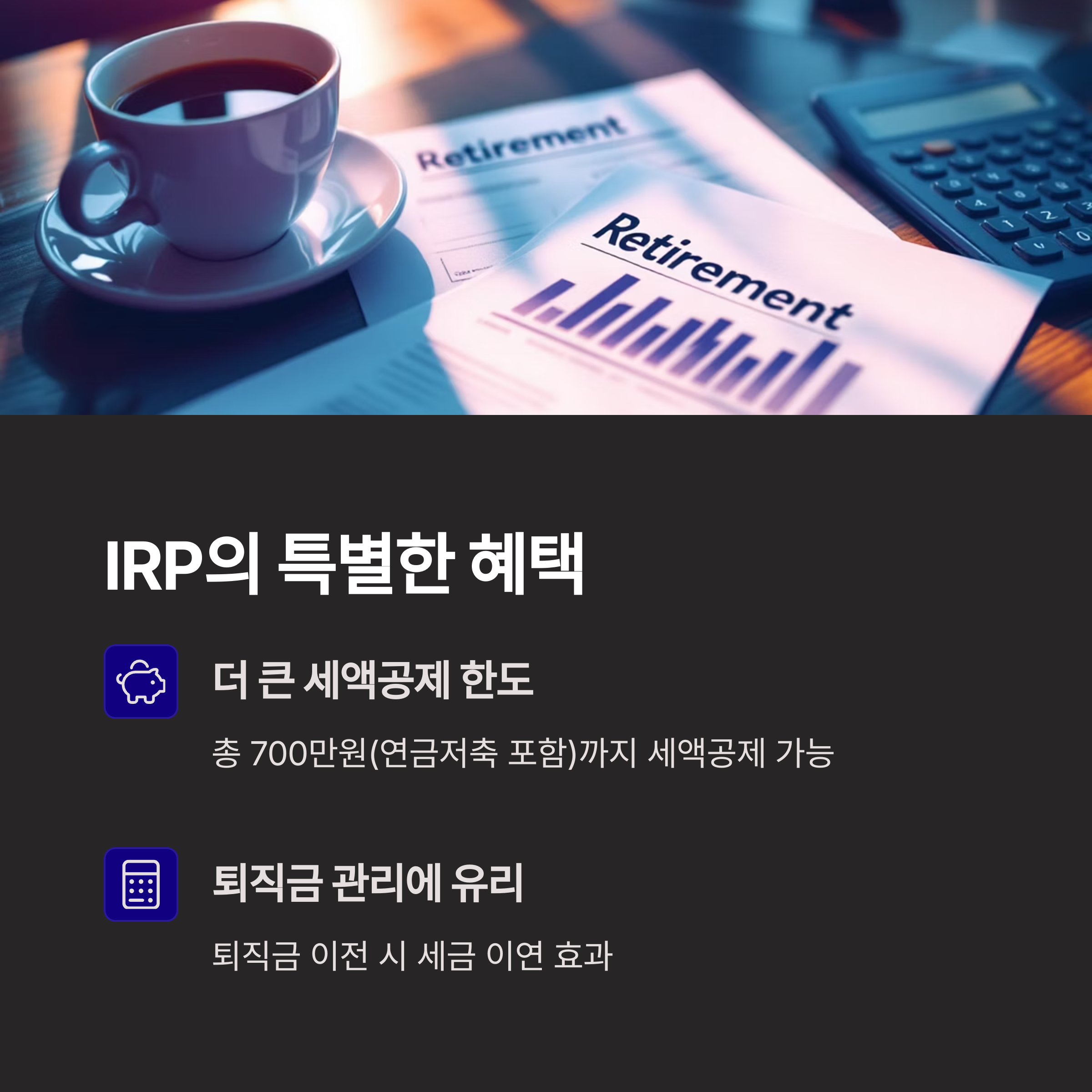 IRP는 직장인의 퇴직금을 이전하거나, 개인이 추가로 불입할 수 있는 퇴직연금 계좌입니다.