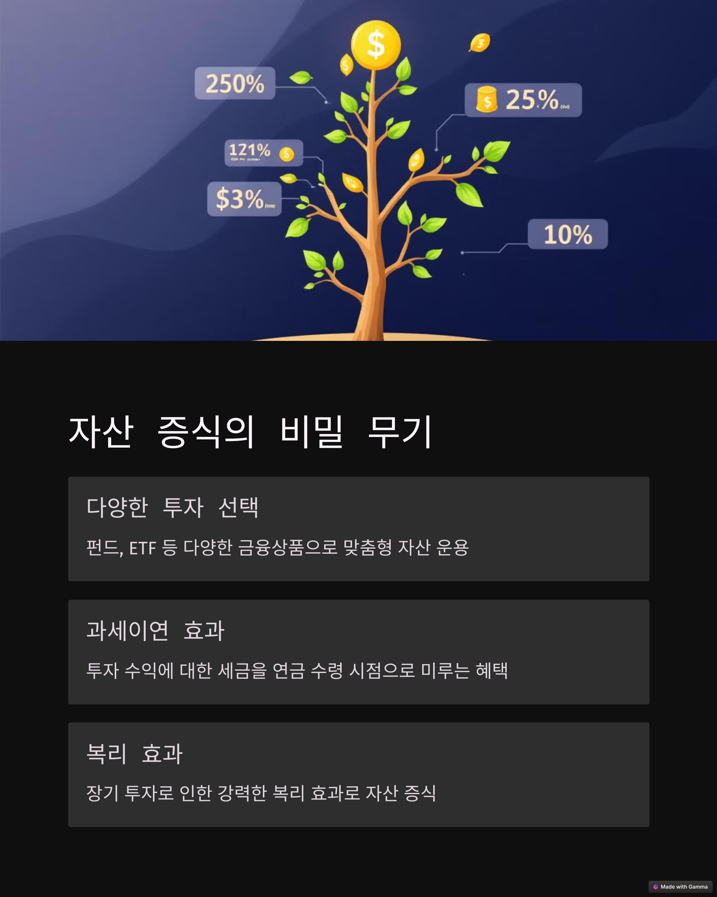 | 최대 16.5% 공제율, 소득구간별 차등 적용 | 55세 이후 10년 이상 연금으로 수령 | ETF, 펀드형 등으로 자산운용 가능 |