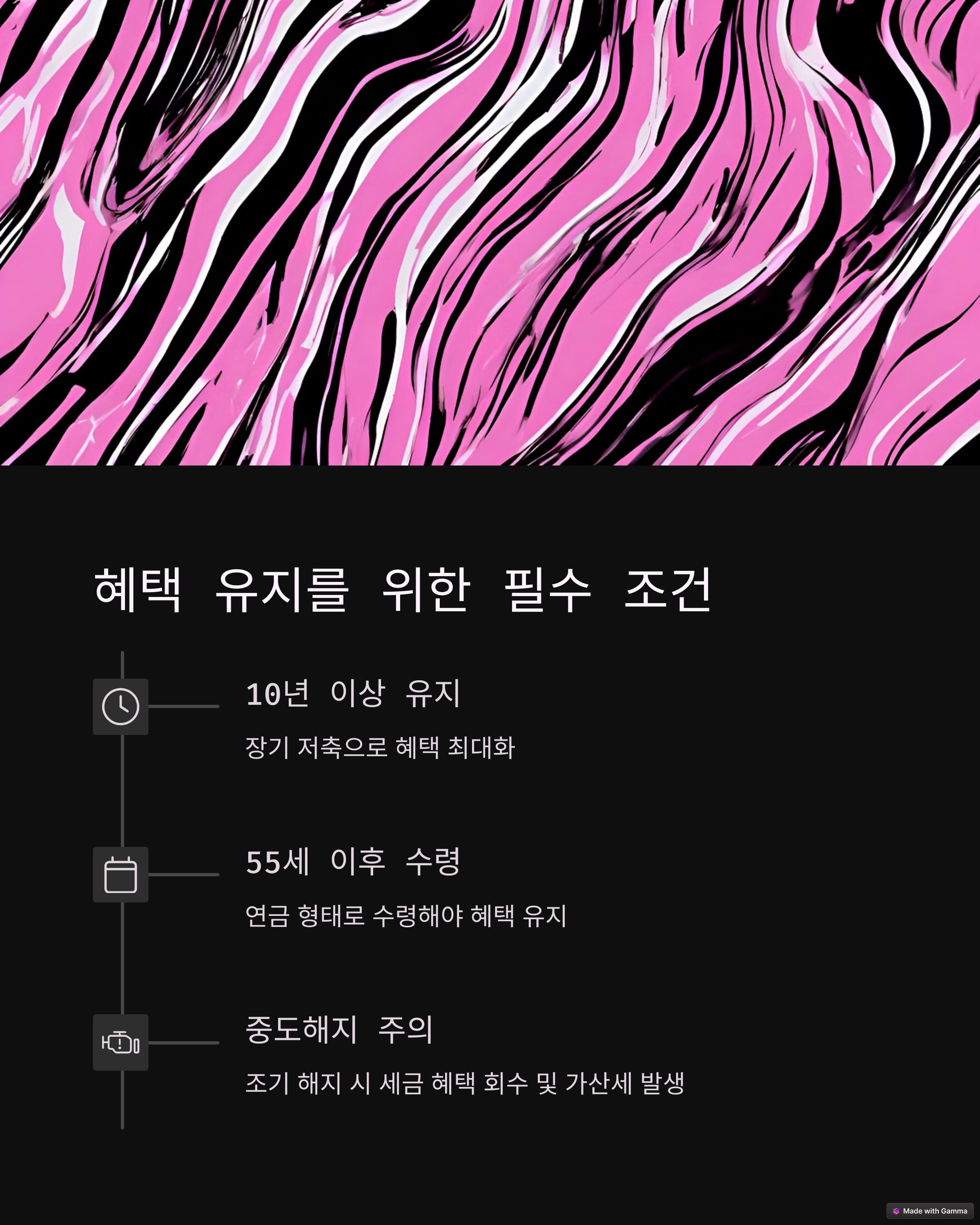 연금저축은 10년 이상 유지가 기본 조건입니다. 중도 해지하거나 55세 이전에 수령하면 세액공제 받은 금액에 대해 기타소득세 16.5%를 추가 납부해야 합니다. 따라서 가입 전에는 자금 여유와 수령 시기를 충분히 고려해야 하며, 장기적으로 연금 수령 계획을 세우는 것이 핵심입니다.