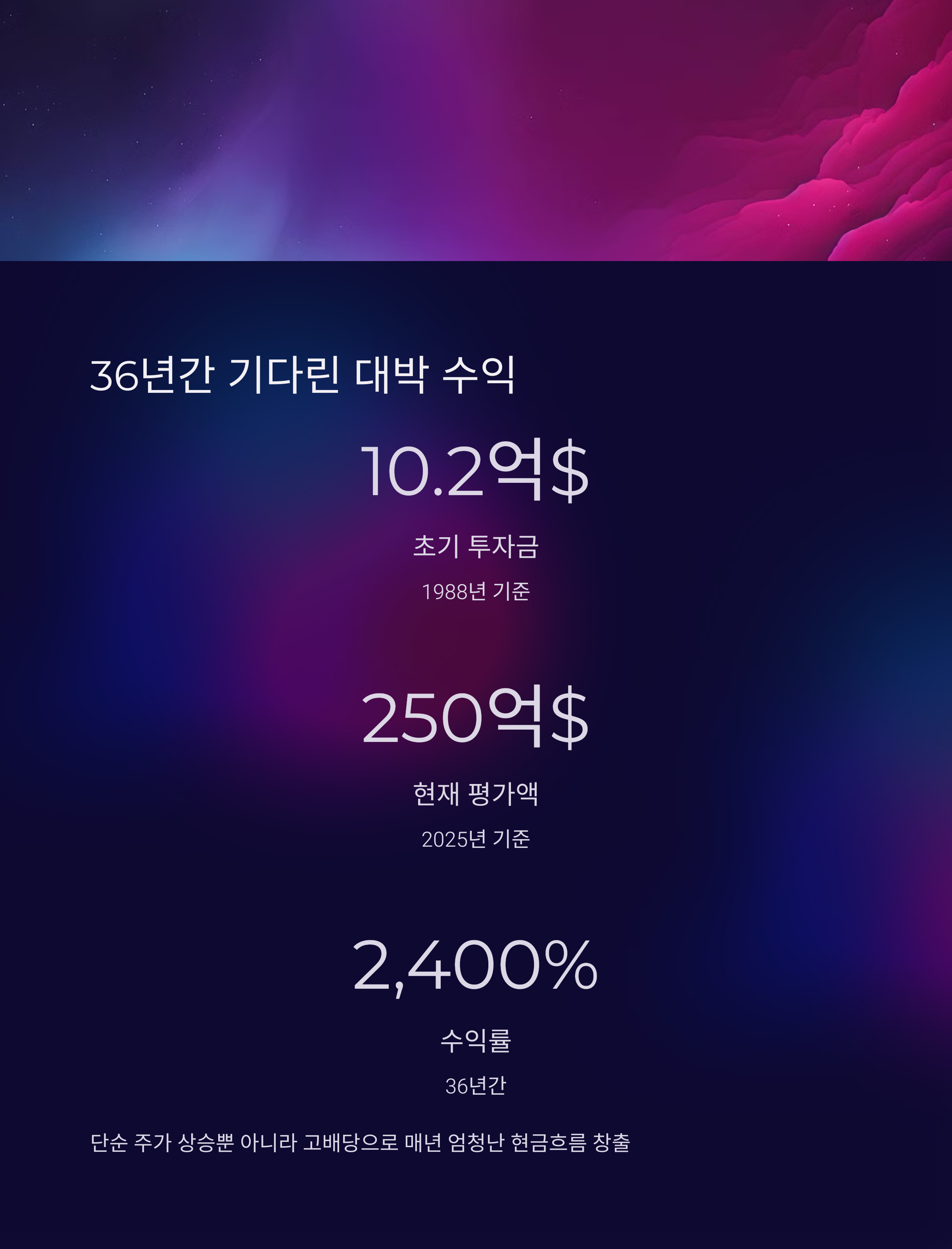 → 4억 주 × 1.84달러 = 연간 약 7억 3,600만 달러 배당 수익