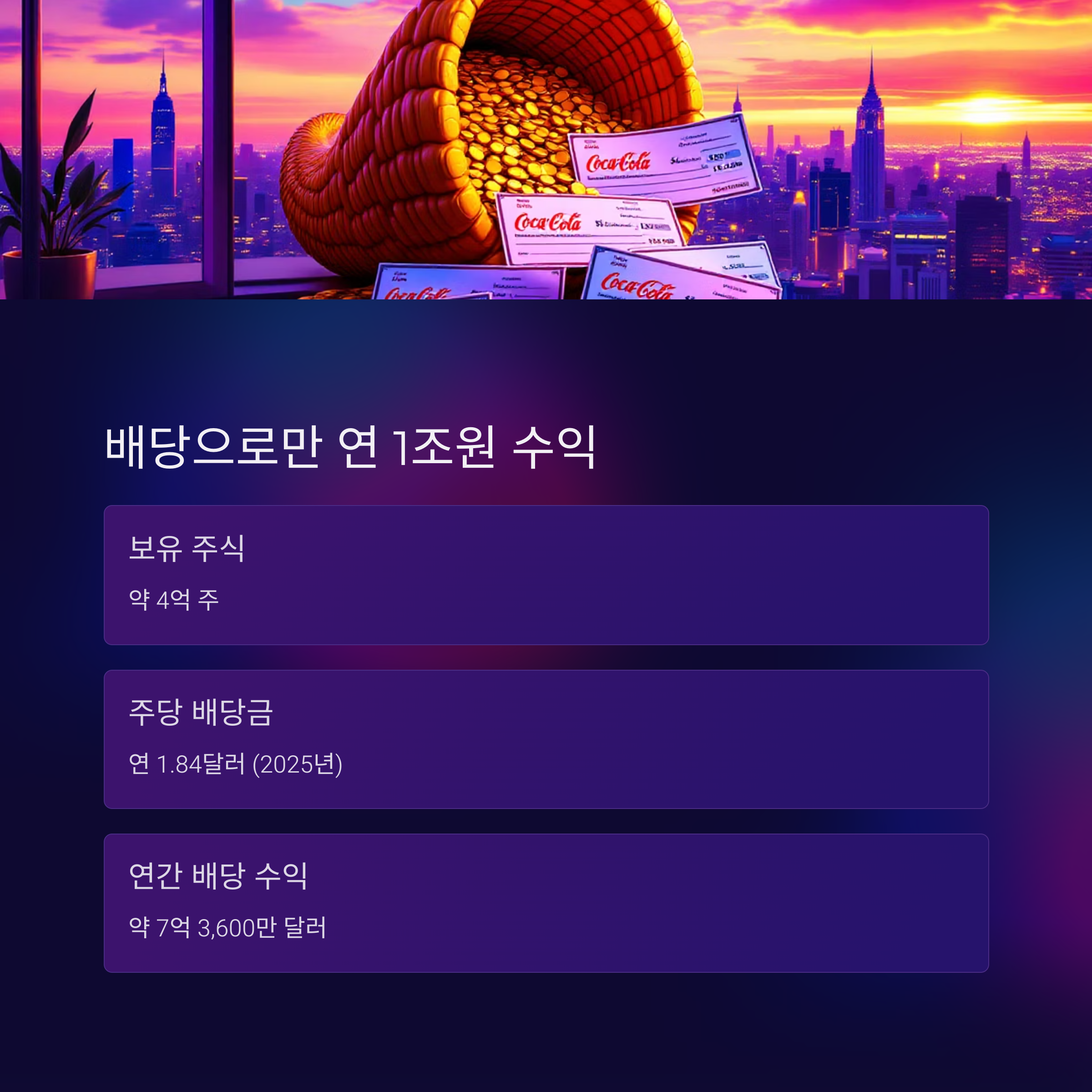 - 코카콜라의 주당 배당금: 연 1.84달러 (2025년 기준)