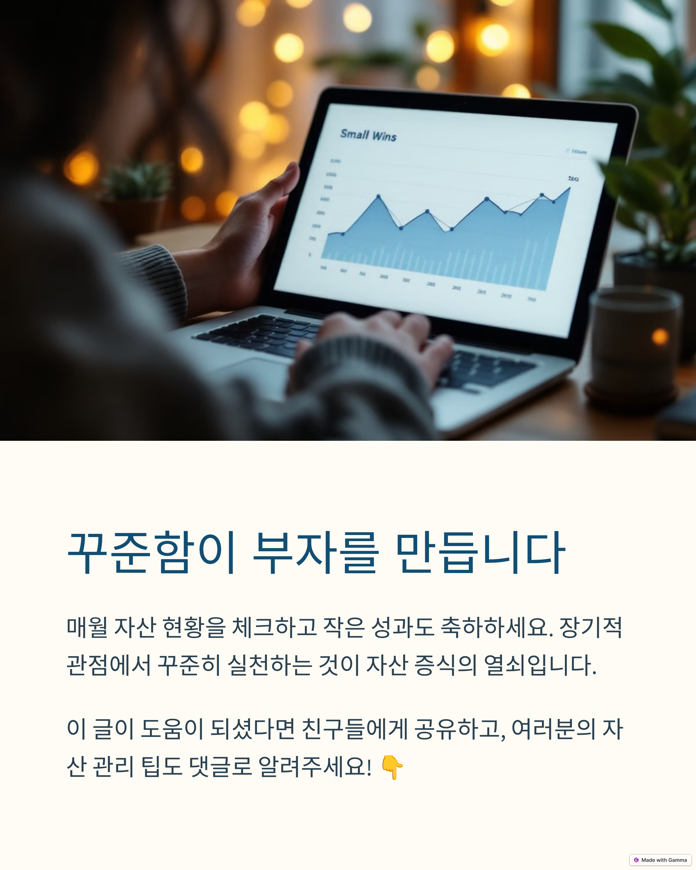 자산은 단순히 높은 수입에서만 만들어지지 않습니다. 지속 가능한 습관과 구조가 자산을 형성하고 키워갑니다. 하루아침에 큰 돈을 벌 순 없지만, 매달 반복되는 소비를 점검하고, 꾸준히 저축하고, 공부하고, 투자하는 태도를 가진다면 누구든 지금보다 더 나은 재무 상태를 만들 수 있습니다. 이 글이 여러분의 돈 관리에 작은 영감이 되었길 바라며, 지금부터라도 차근차근 실천해보세요. 변화는 작고 느리게 시작되지만, 분명한 방향이 있다면 결과는 반드시 따라옵니다.