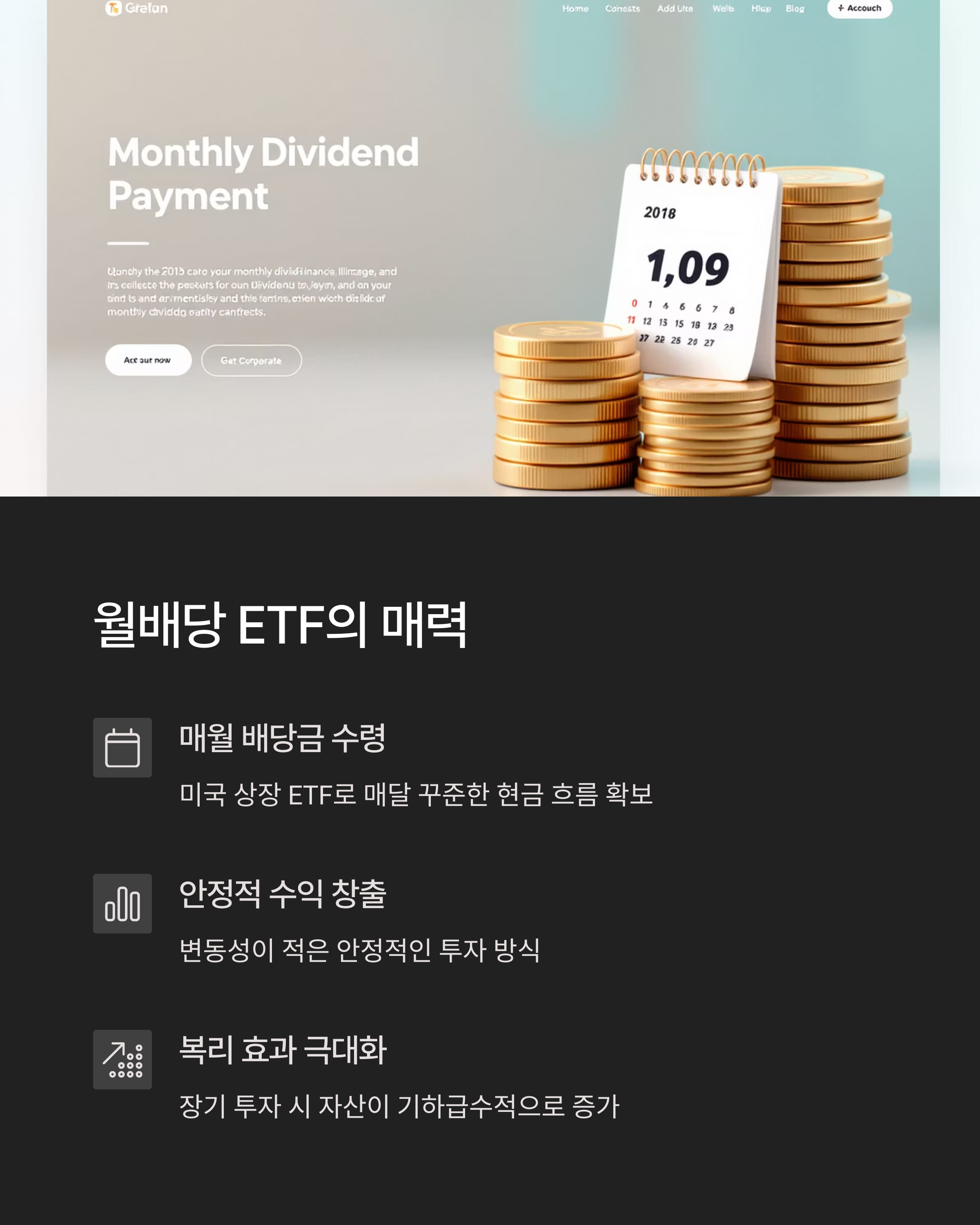 | 매달 배당을 지급받는 ETF 투자 방식 | 꾸준히 투자하며 복리 효과 누리는 전략 | 연평균 약 5~6%의 안정적 수익률 유지 |