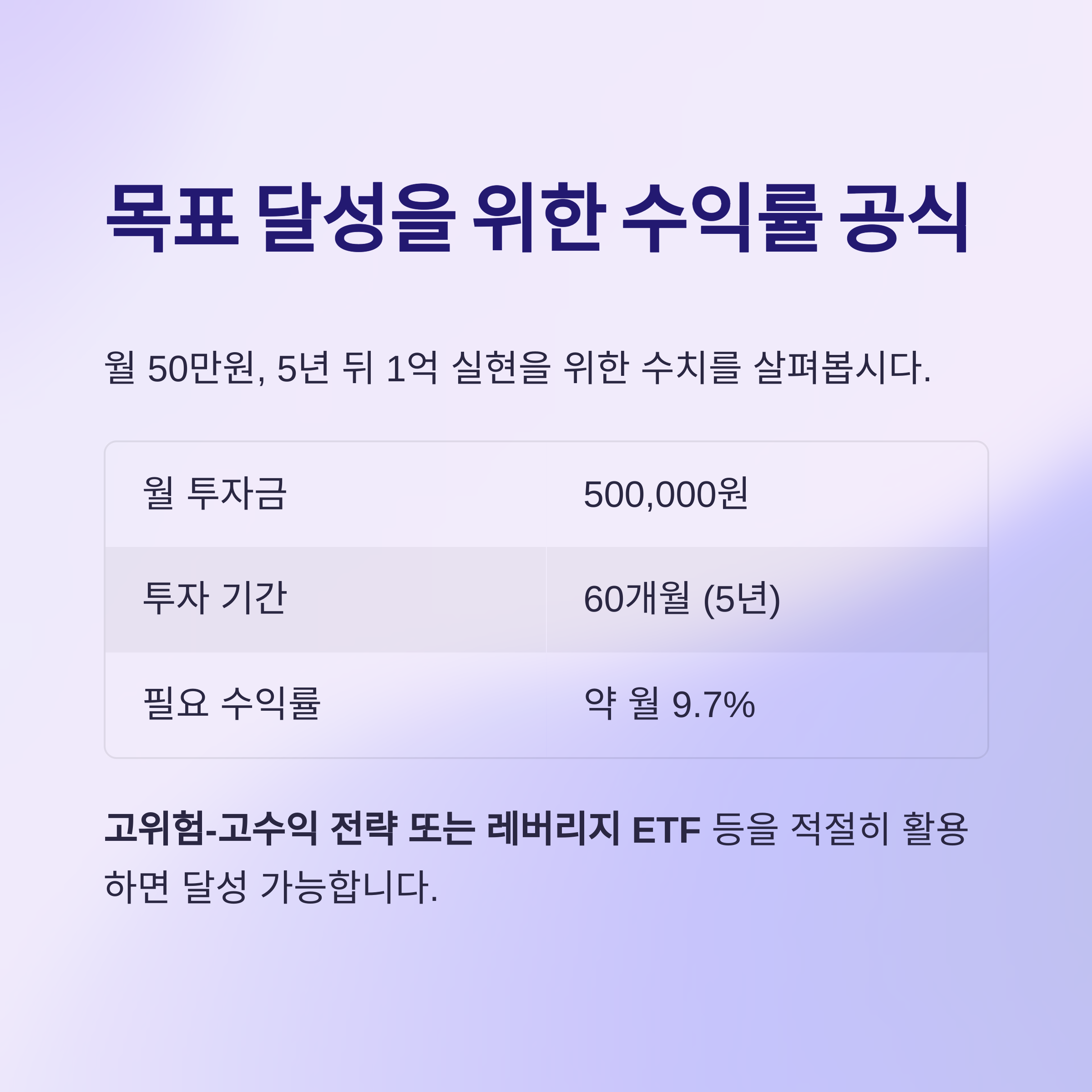 이 수치는 현실적으로 쉽지 않지만, 고위험-고수익 전략 또는 레버리지 ETF 등을