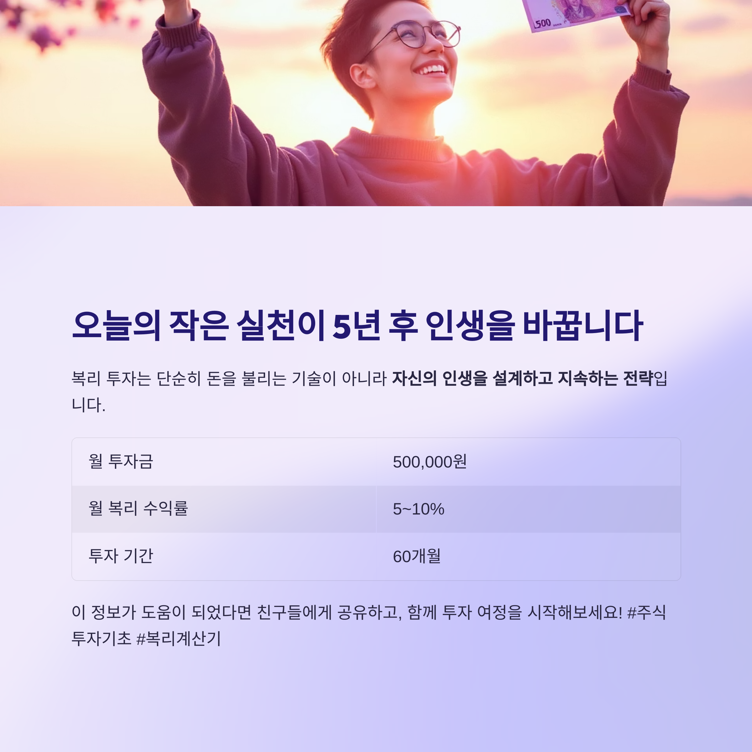 이 글에서는 월 50만원 투자로 5년 후 1억을 목표로 하는 복리 전략을