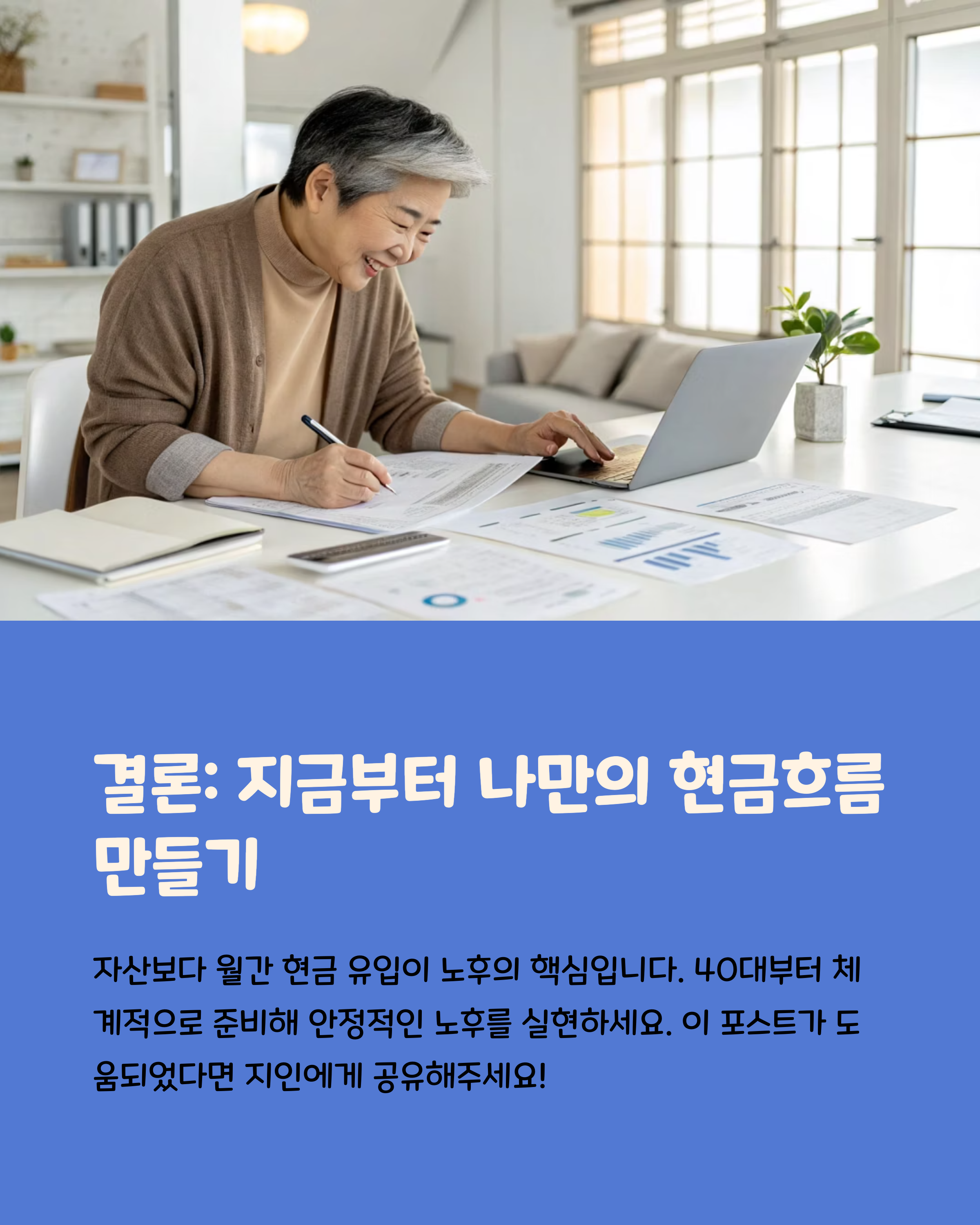노후는 단지 쉬는 시간이 아니라, 새로운 삶의 전환기입니다. 이 시기를 경제적으로 안정되게 보내기 위해서는 젊을 때부터의 준비가 무엇보다 중요합니다. 다양한 수익원을 마련하는 것은 단순한 재정 설계를 넘어서 자신감 있는 삶을 위한 투자입니다. 여러분의 퇴직 후 삶이 걱정이 아닌 기대가 되기를 바랍니다.