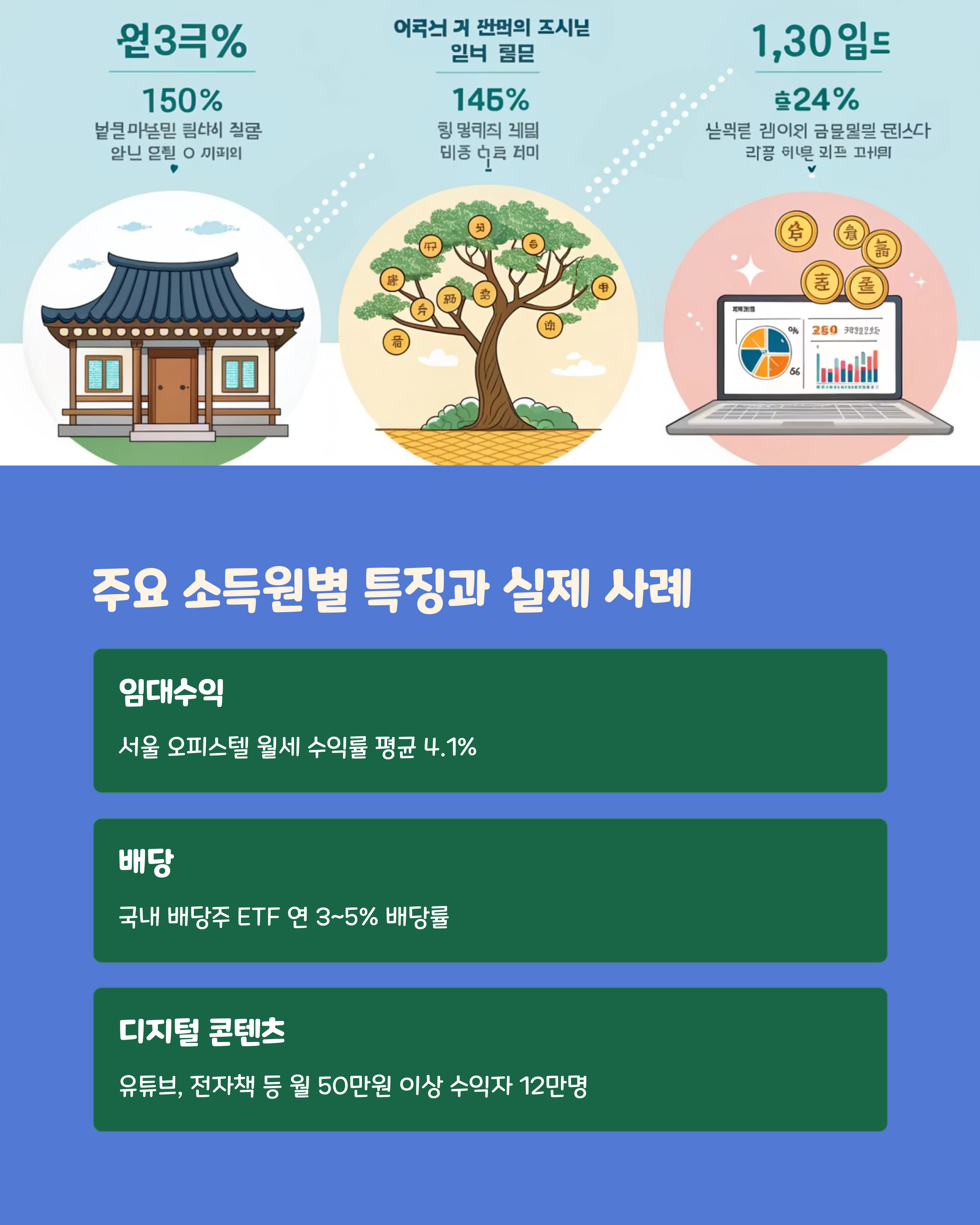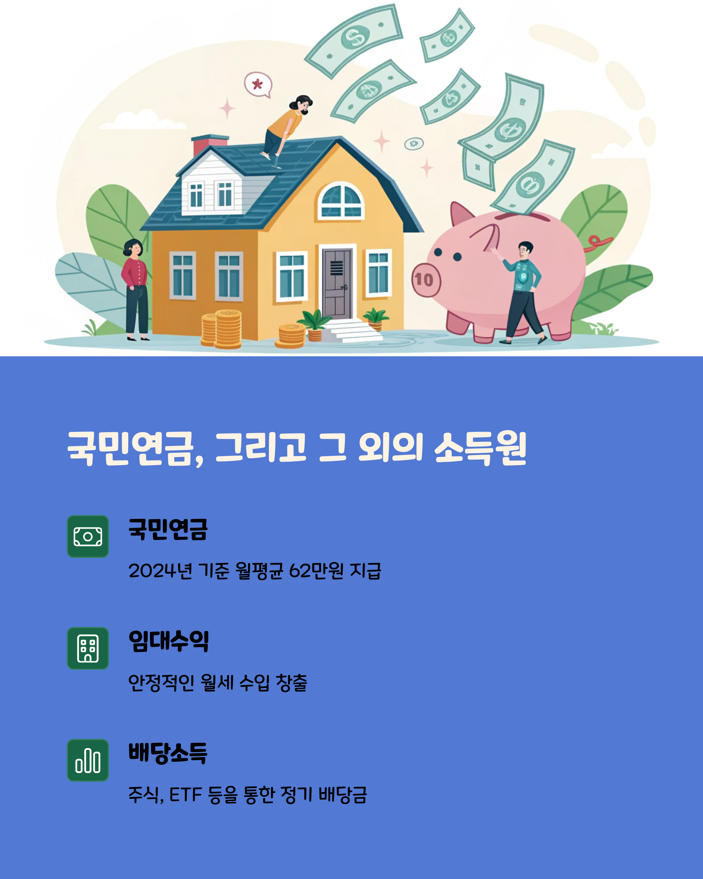 | 주요 소득원 종류 | 연금, 임대수입, 배당, 온라인 수익, 1인 비즈니스 등 |