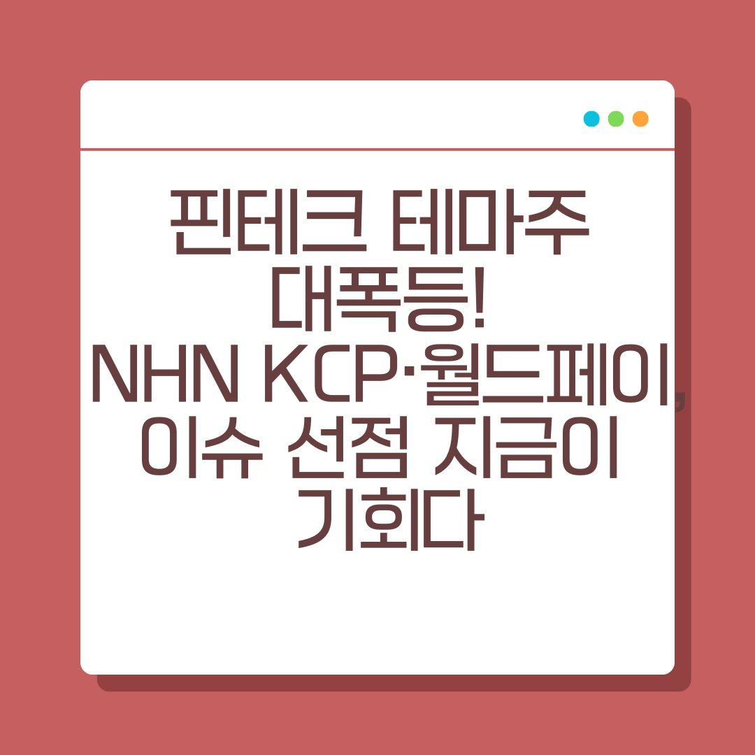 최근 증시에서 핀테크 관련주가 급등세를 보이며 투자자들의 관심을 끌고 있습니다. NHN KCP와 월드페이를 중심으로 한 글로벌 결제 인프라 기업들이 주목받는 가운데, 국내외 증시에서 폭발적인 수급이 감지되고 있습니다. 핀테크 대장주 흐름부터 단기 급등 포인트까지, 지금 꼭 체크해야 할 핵심 내용을 정리해드립니다.