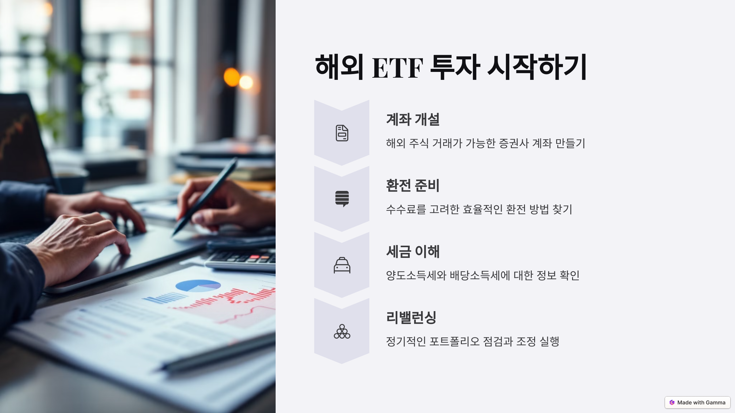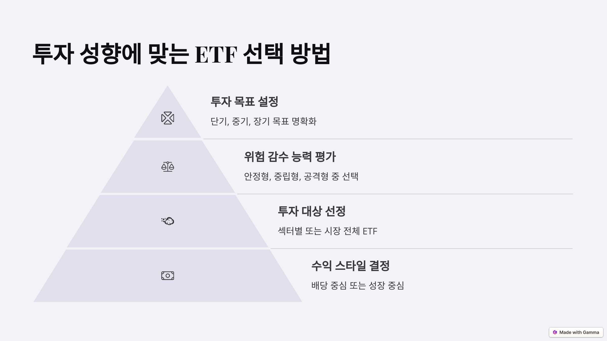 해외 ETF 투자를 시작할 때 가장 먼저 고려해야 할 부분은 자신의 투자 성향과 목표입니다. 단기 수익을 목표로 하는 분들과 장기적인 자산 형성을 원하는 분들에 따라 접근 방법이 달라져야 합니다. ETF는 특정 지수를 추종하기 때문에 종목 선정에 있어 분산 투자 효과가 있지만, 그 안에 포함된 자산의 성격에 따라 리스크 수준도 달라집니다. 따라서 ETF 선택 시에는 섹터, 지역, 자산군 등 세부 구성 요소를 반드시 확인하는 것이 중요합니다.
