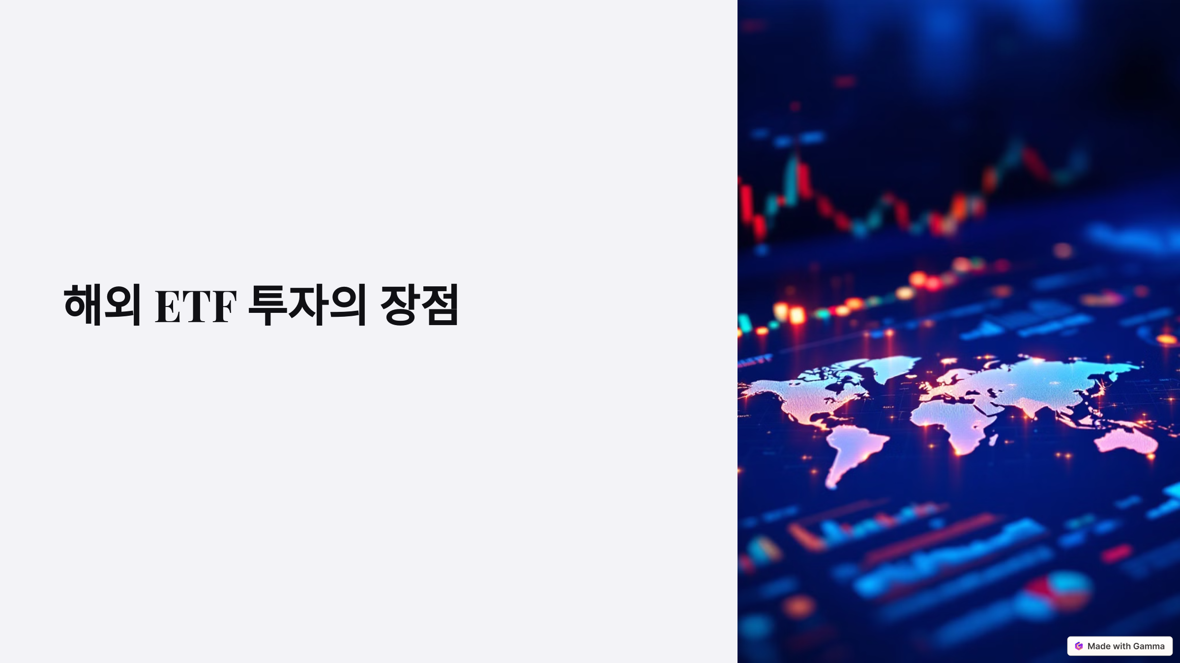| 해외 ETF 장점 | 글로벌 자산에 저비용으로 간편하게 투자 가능 |