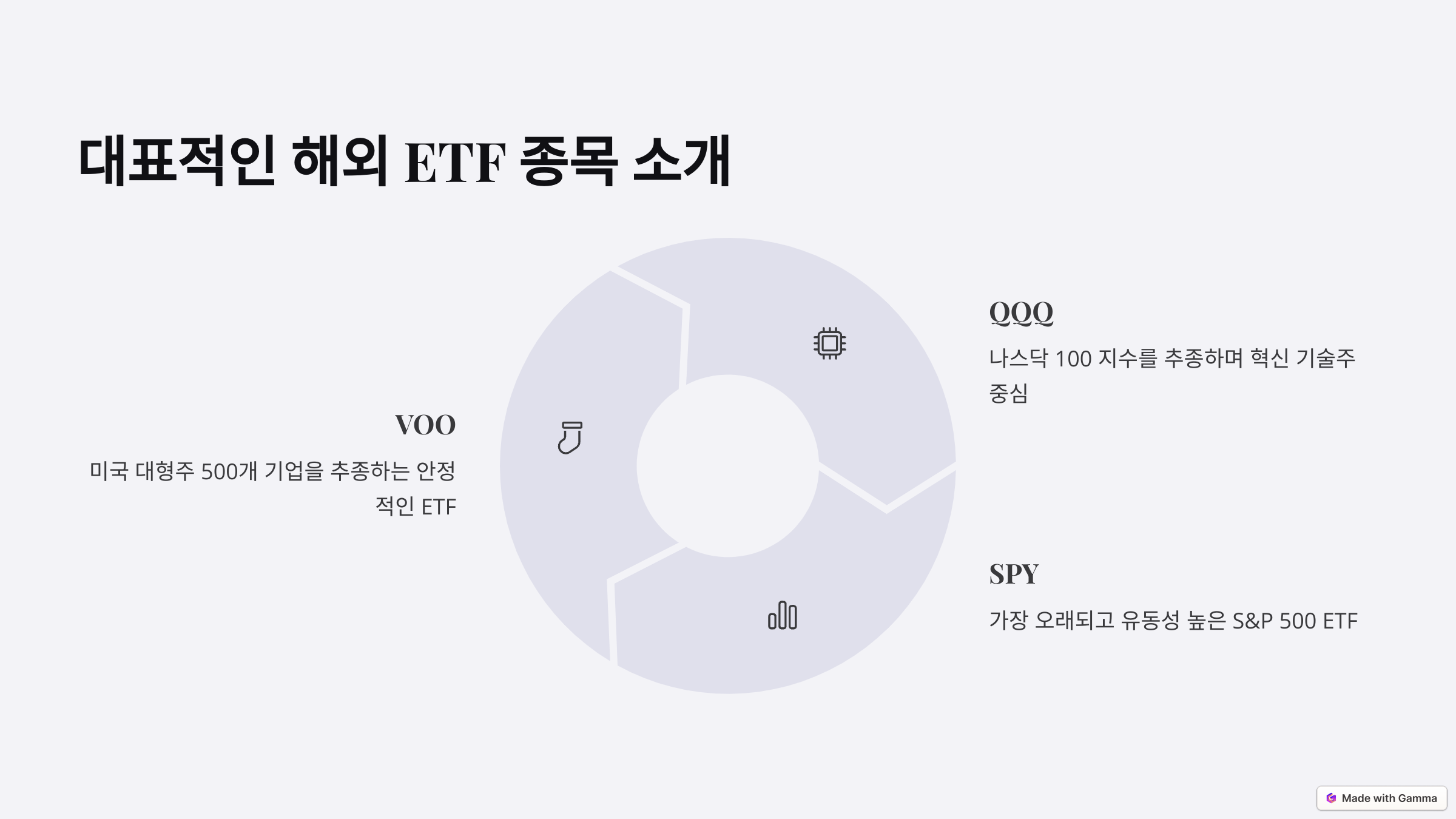 | ETF란? | 상장지수펀드로, 다양한 자산에 분산 투자 가능 |