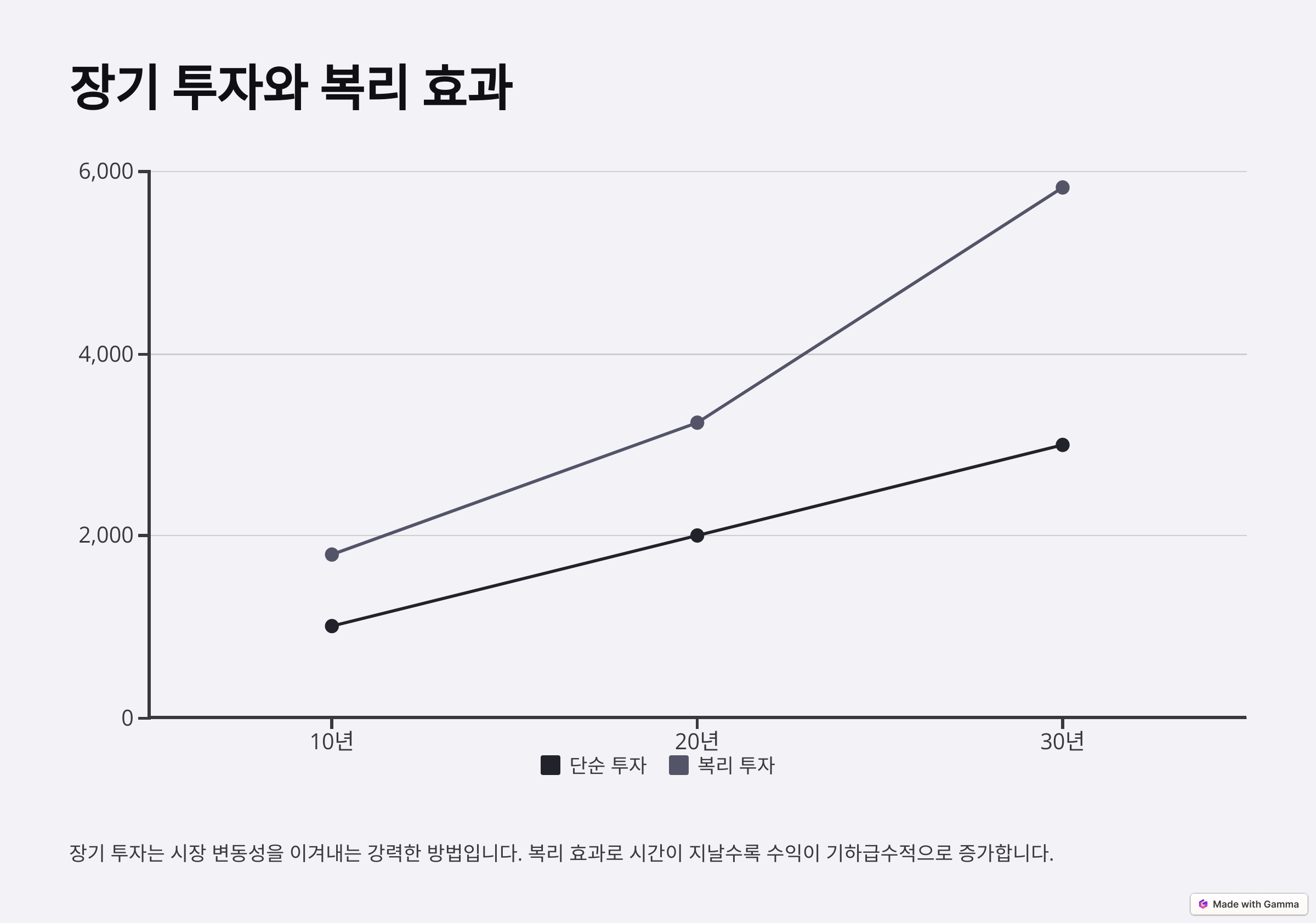 ETF 투자의 핵심은 장기적 안목과 분산 투자입니다. 단일 종목이 아닌 광범위한 자산군에 투자함으로써 리스크를 줄이고 시장 전체의 성장을 함께 누릴 수 있는 전략이 바로 ETF입니다. 매월 일정 금액으로 꾸준히 투자하는 적립식 투자는 시간 분산 효과를 극대화할 수 있으며, 시장 하락기에도 꾸준한 매수가 가능하다는 장점이 있습니다. 무엇보다도 자신만의 투자 원칙을 세우는 것이 가장 중요합니다.