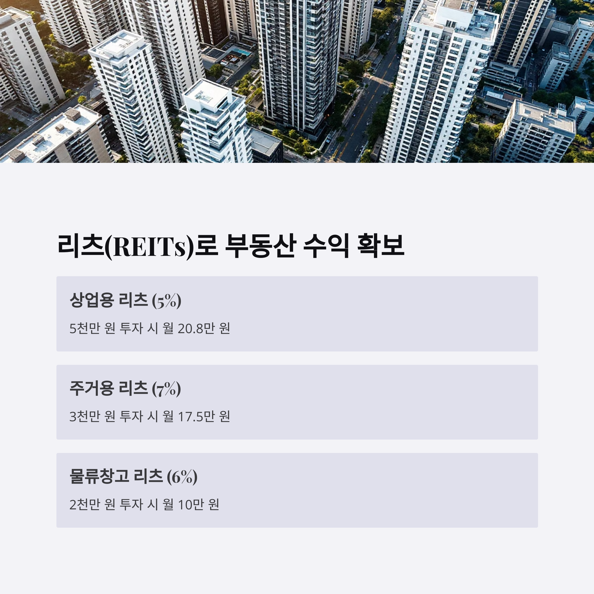 | 상업용 리츠 | 5% | 5천만 원 | 208,333원 |