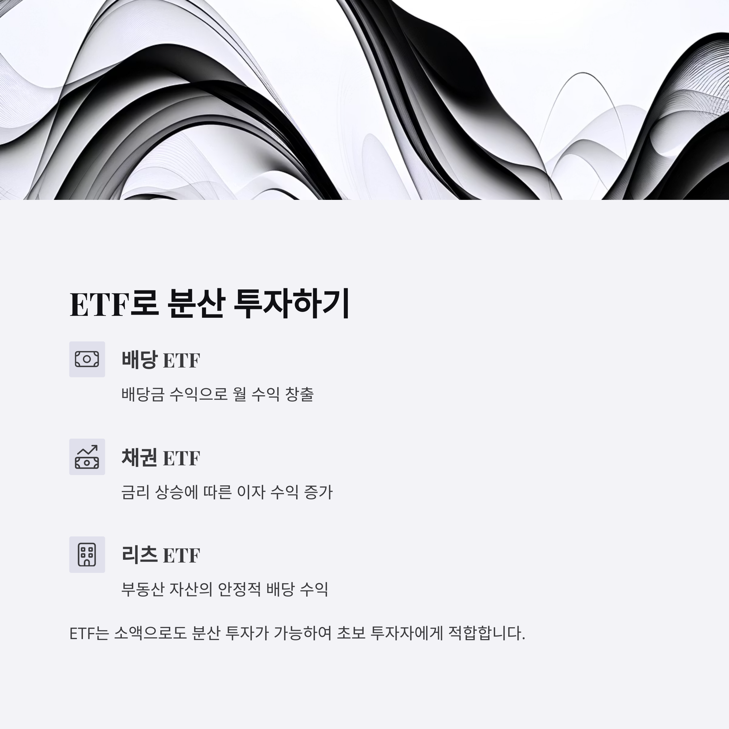 - 배당 ETF: 배당금 수익을 통해 월 수익 창출