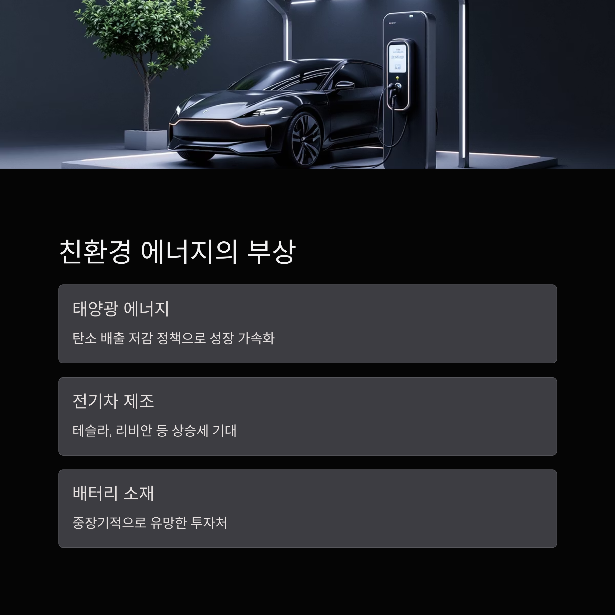 태양광, 수소 에너지, 전기차 배터리 관련 기업들은 중장기적으로 유망한 투자처입니다.
