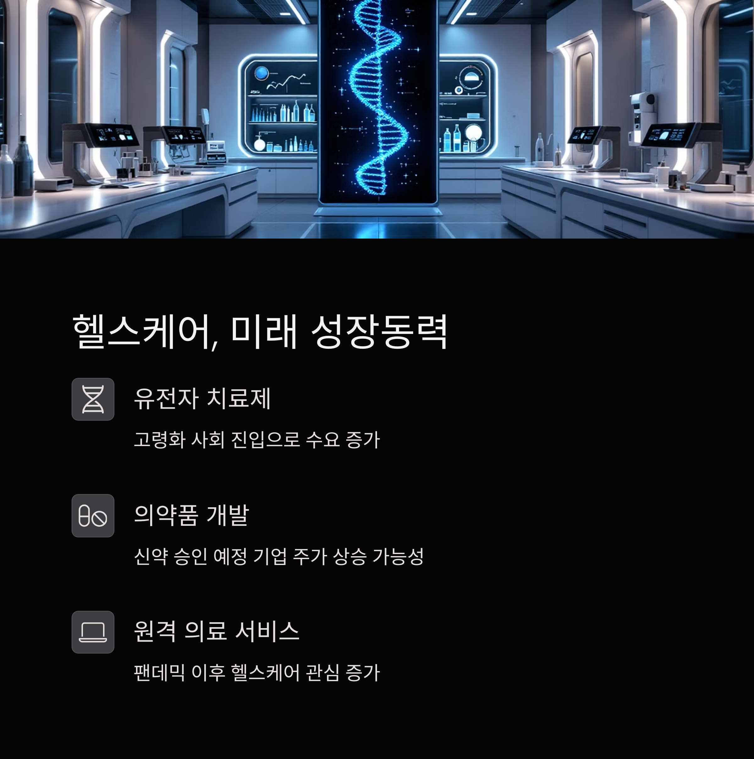의약품 개발, 유전자 치료제, 원격 의료 서비스 기업들이 대표적인 예입니다.