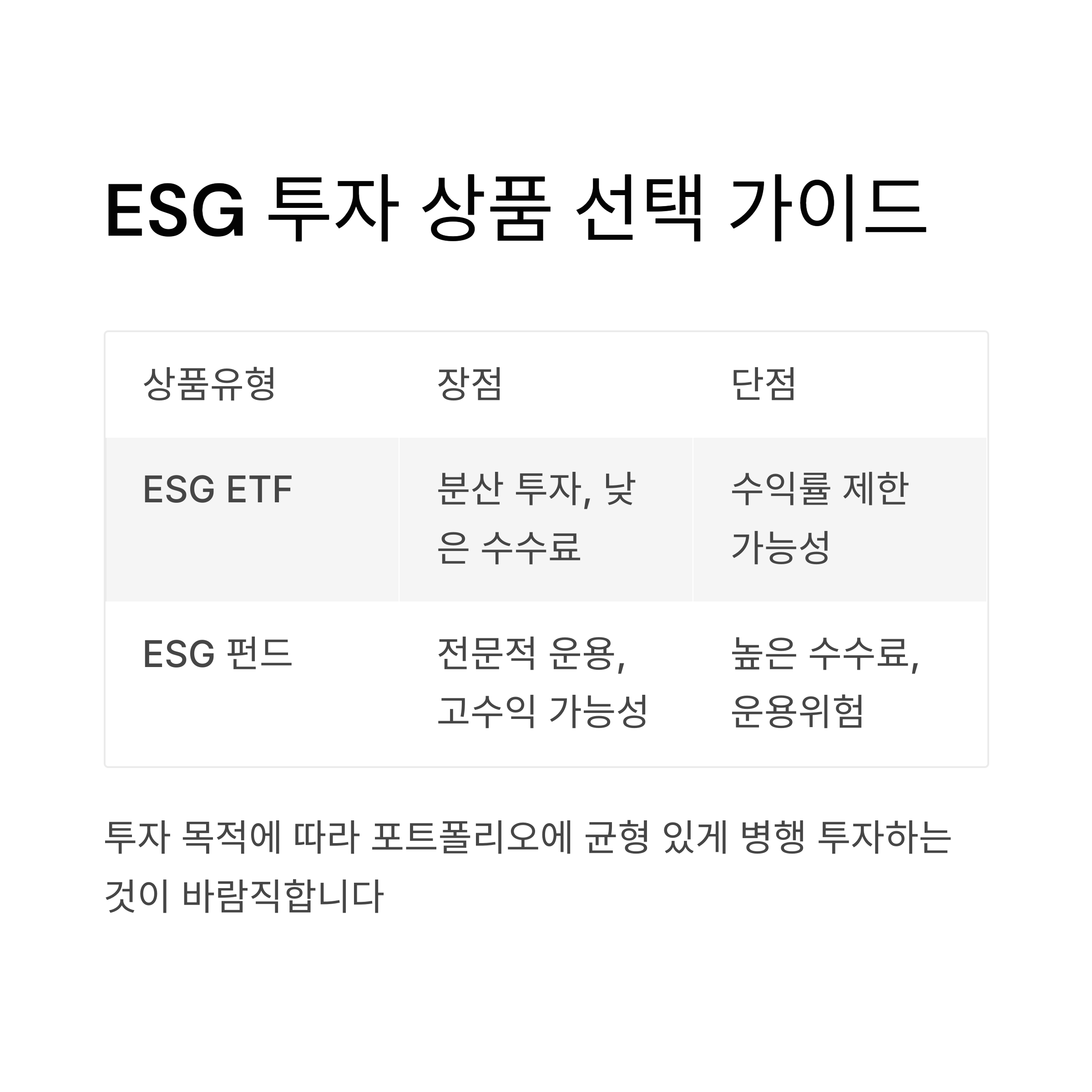 | ESG 펀드 | 전문적 운용, 고수익 가능성 | 높은 수수료, 운용위험 있음 |