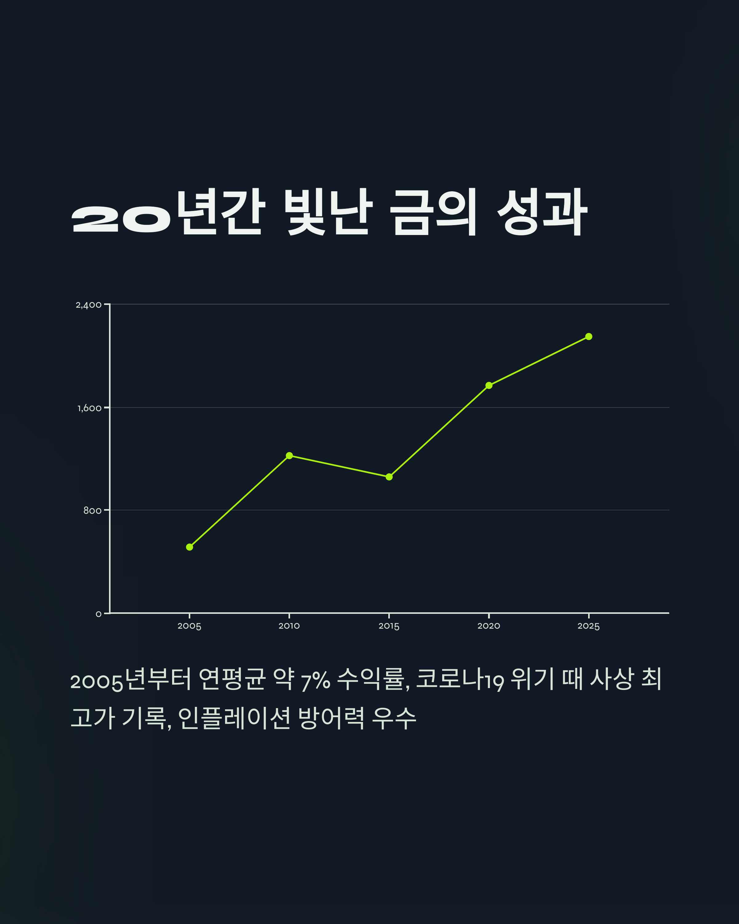 | 금 가격 추이 | 2015년~2025년까지 꾸준히 우상향하며 안정성 입증 |