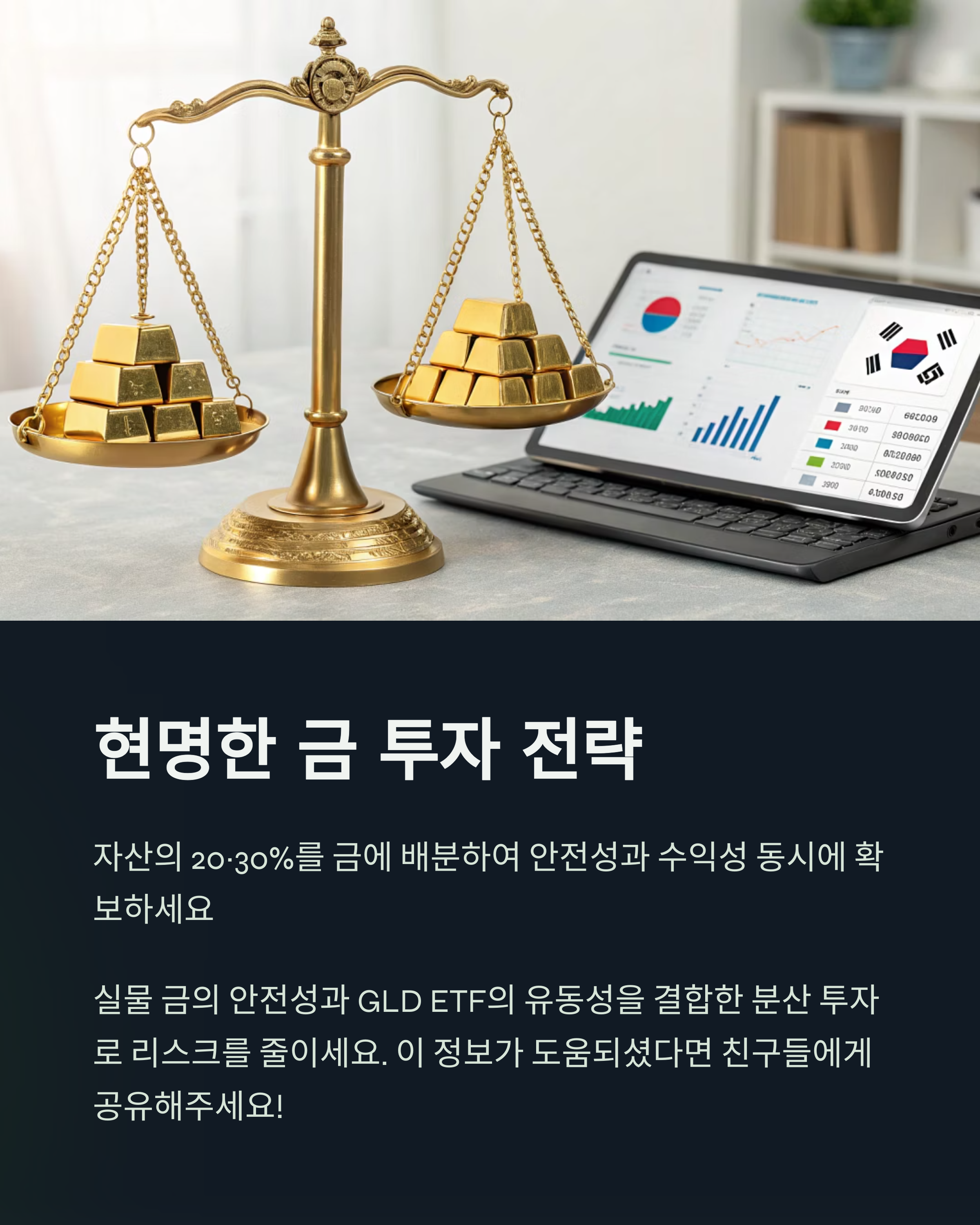 제 개인 경험상 금은 단기차익보다는 장기적인 포트폴리오 안정에 더 효과적입니다. 특히 5년 이상 보유하면 실물 금은 환율 영향을 덜 받고, GLD ETF는 배당은 없지만 시장 반응이 빠릅니다. 현명한 전략은 둘을 균형 있게 활용하는 것입니다. 2025년 현재, 저는 전체 투자금의 약 20%를 금 자산으로 유지하고 있습니다.