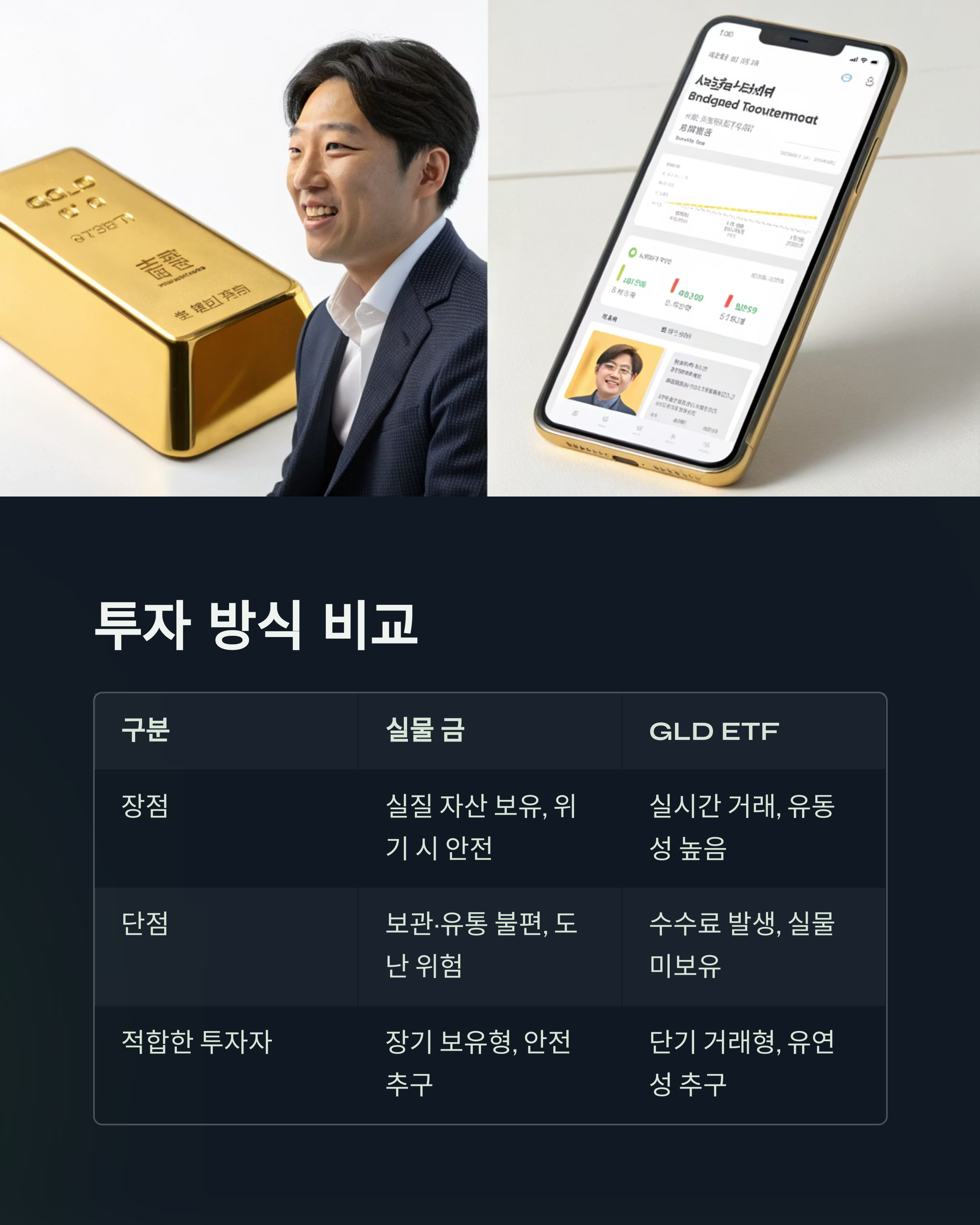 | 실물 금 장점 | GLD ETF 장점 | 리스크 분산 |