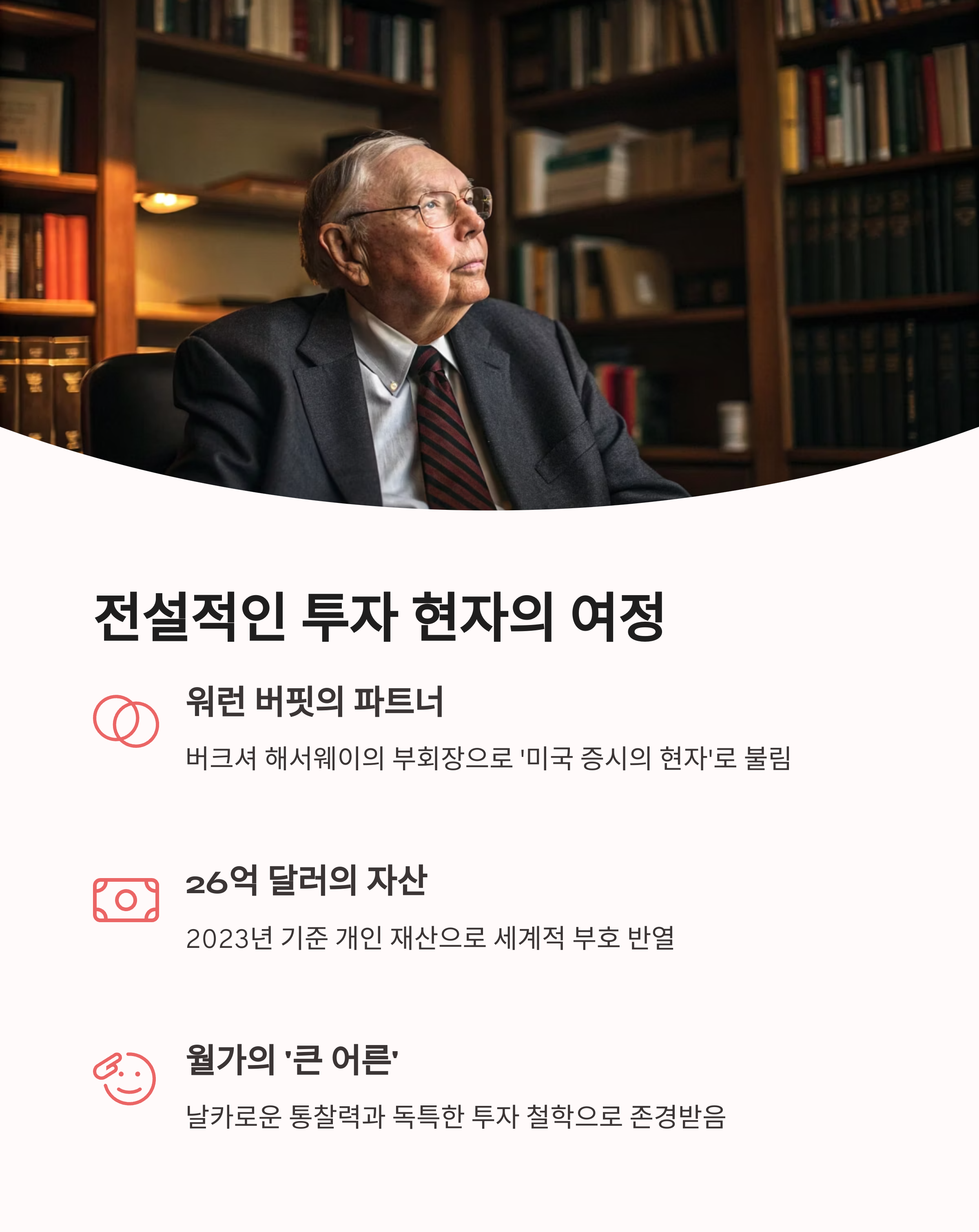 찰리 멍거는 워렌 버핏의 오랜 파트너이자, 버크셔 해서웨이의 부회장으로 널리 알려져 있습니다.