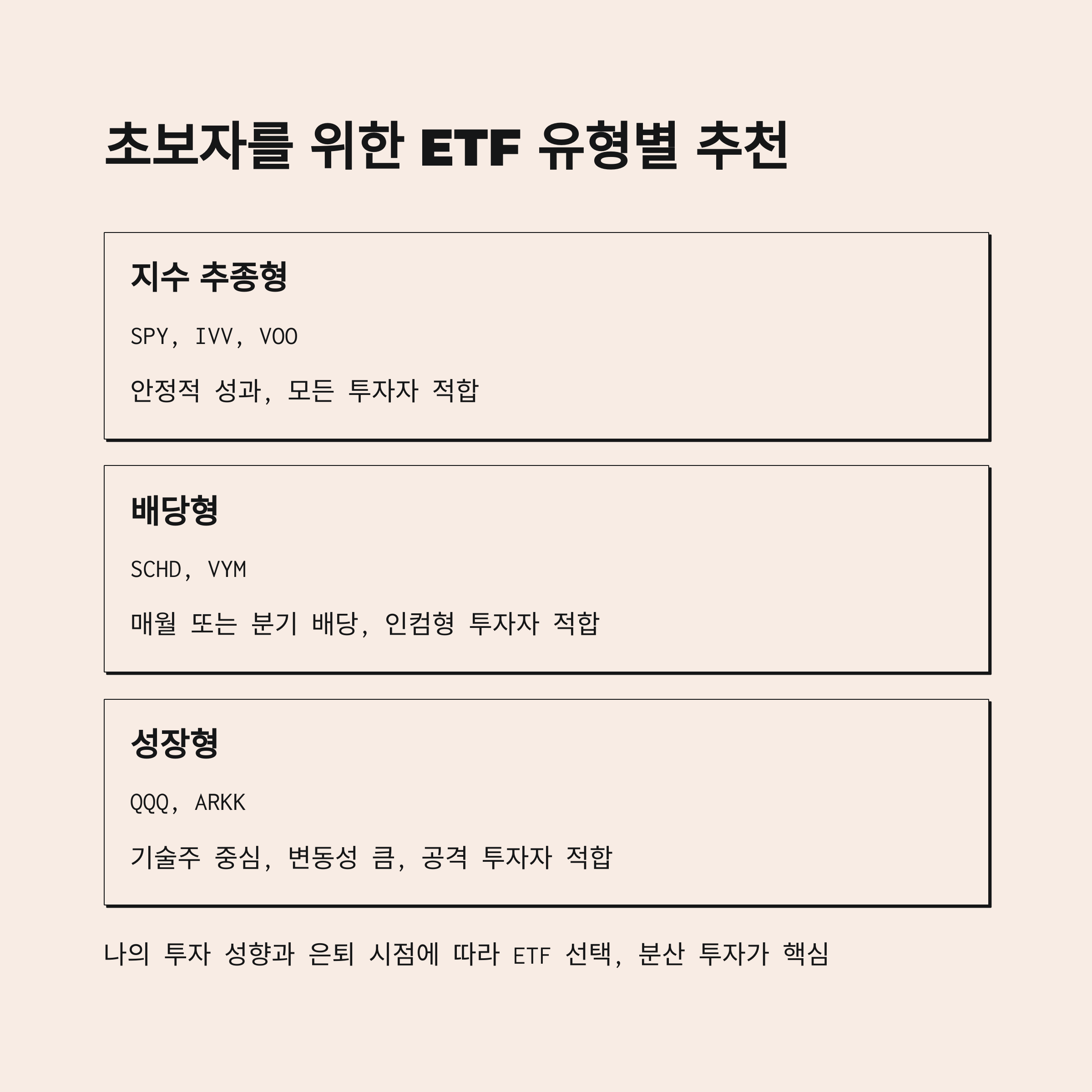| 배당형 | SCHD, VYM | 매월 또는 분기 배당 | 인컴형 투자자 |