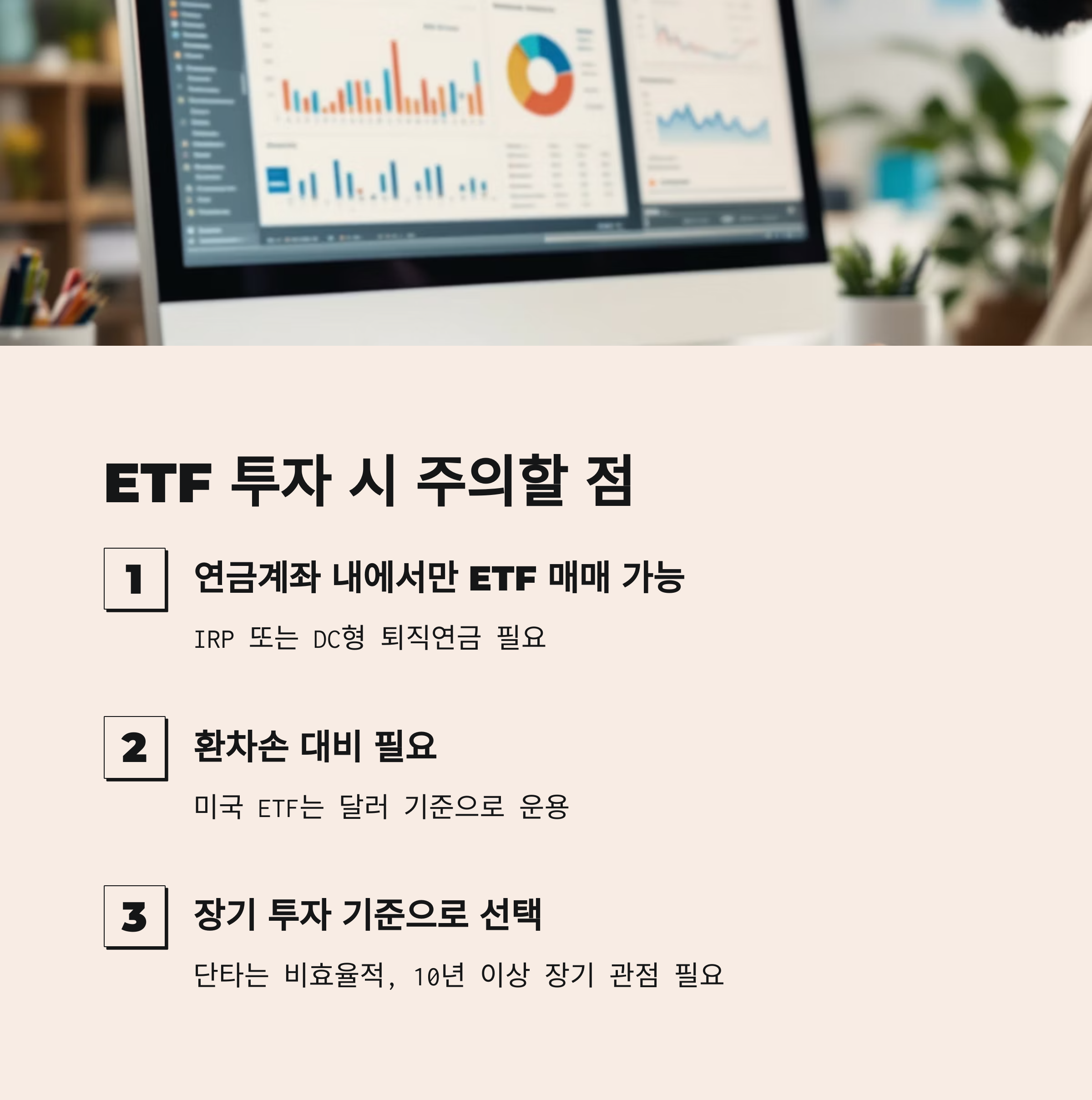 - 연금계좌 내에서만 ETF 매매 가능 (IRP 또는 DC형 퇴직연금 필요)