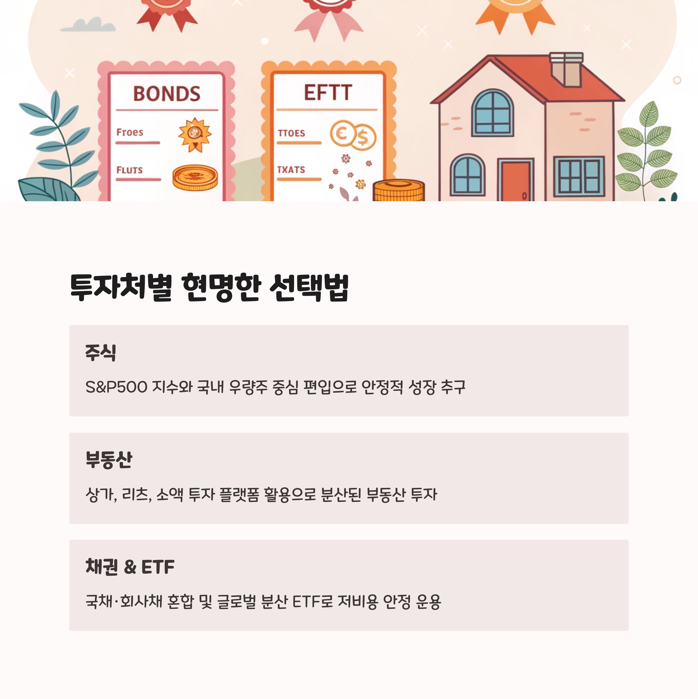 - 셋째, 대체 자산 활용: 부동산, 금, 인프라 펀드 등을 통해 위험을 낮춥니다.