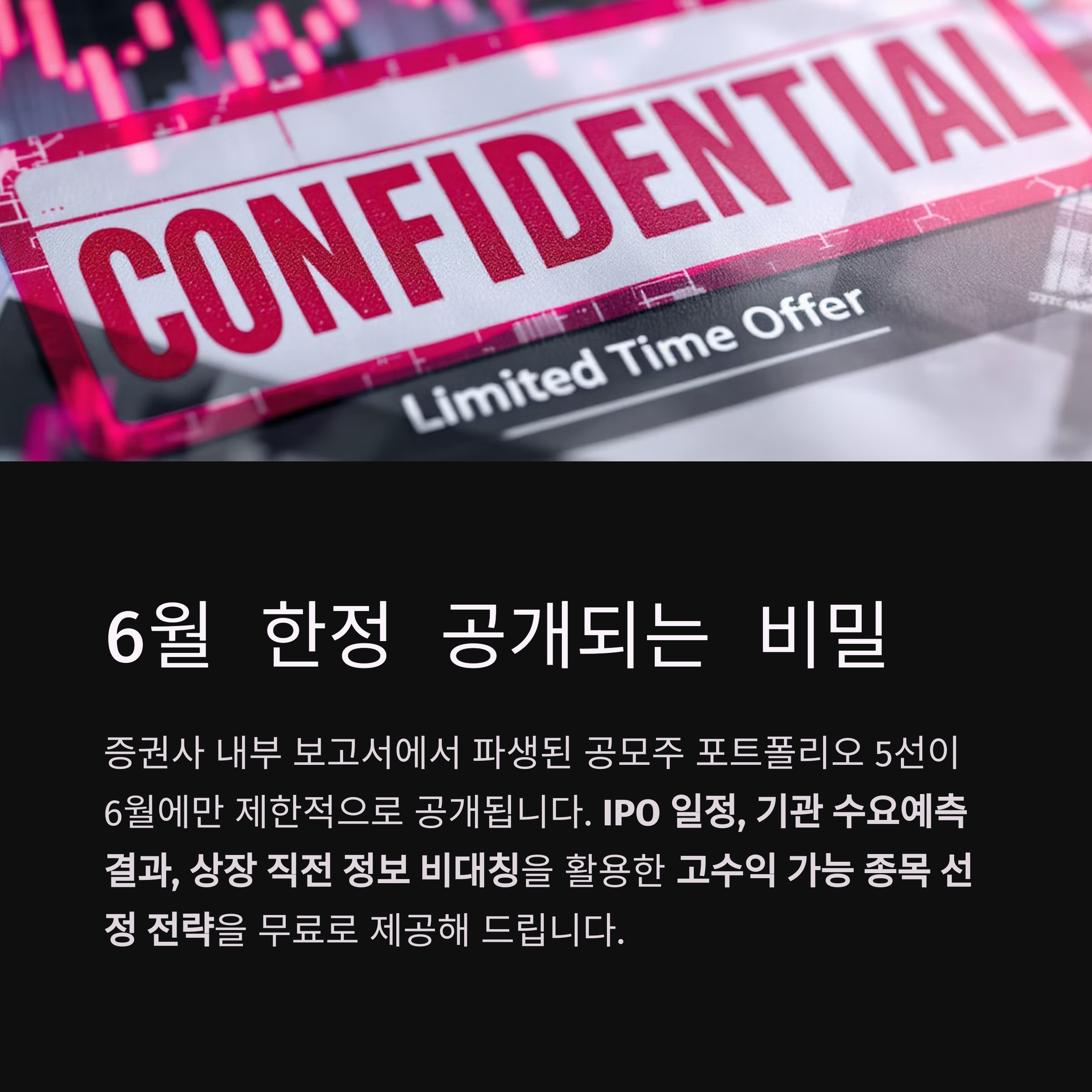 증권사 내부 보고서에서 파생된 공모주 포트폴리오 5선이 6월에만 제한적으로 공개되고 있습니다.