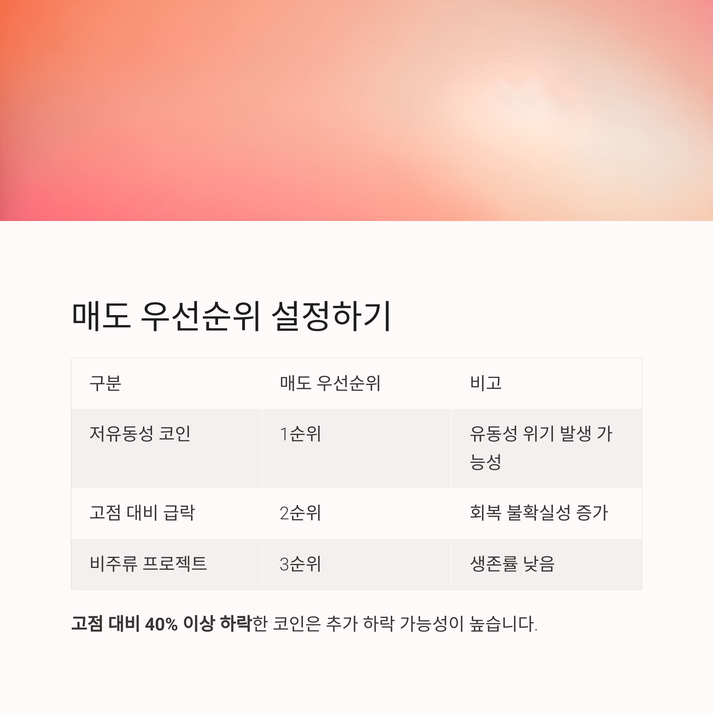 | 저유동성 코인 | 1순위 | 유동성 위기 발생 가능성 |