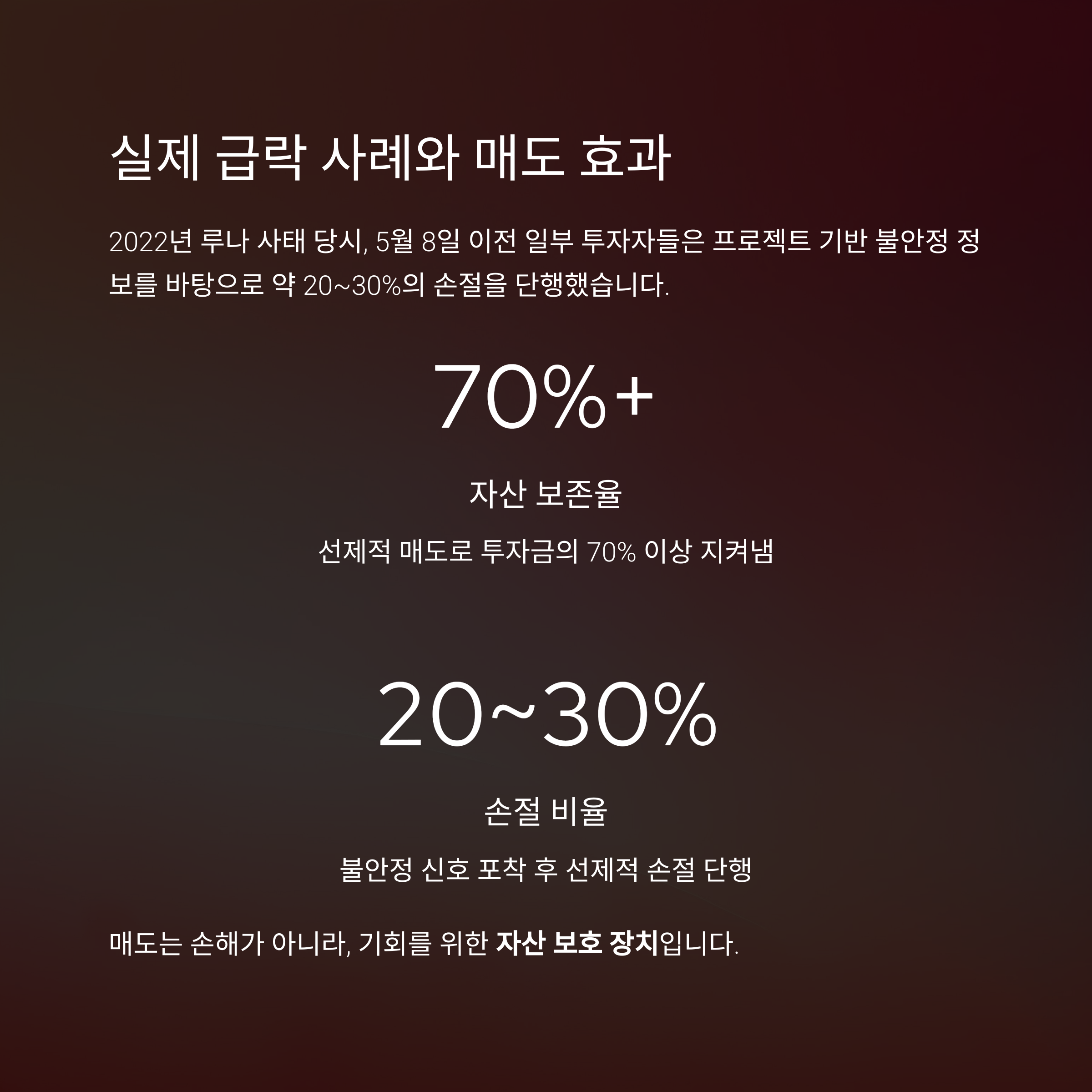 그 결과, 루나 폭락 이후 투자금의 70% 이상을 지켜냈습니다.