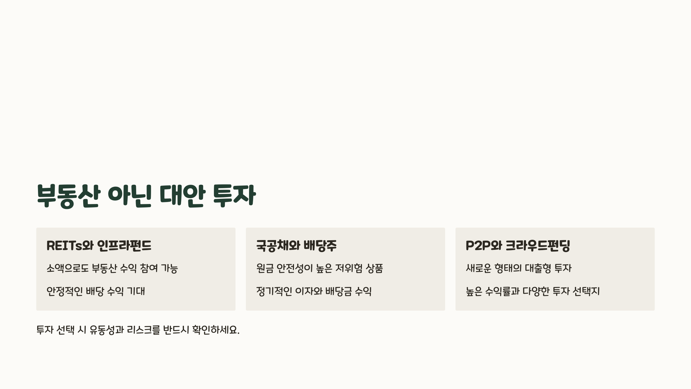 부동산은 초기 자본이 크고, 유동성이 낮다는 단점이 있습니다.