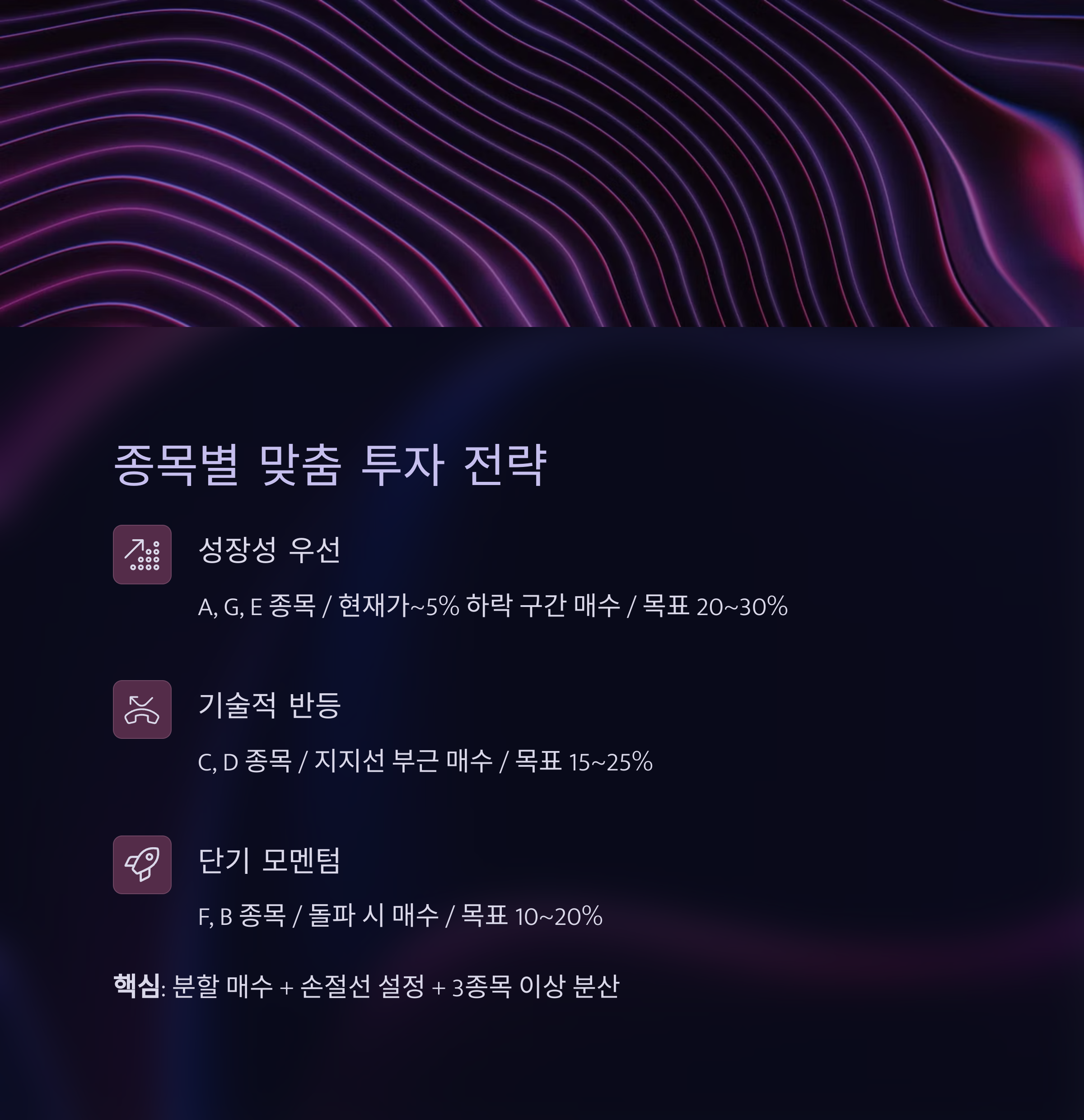 | 성장성 우선 | A, G, E | 현재가~5% 하락 | 20~30% |