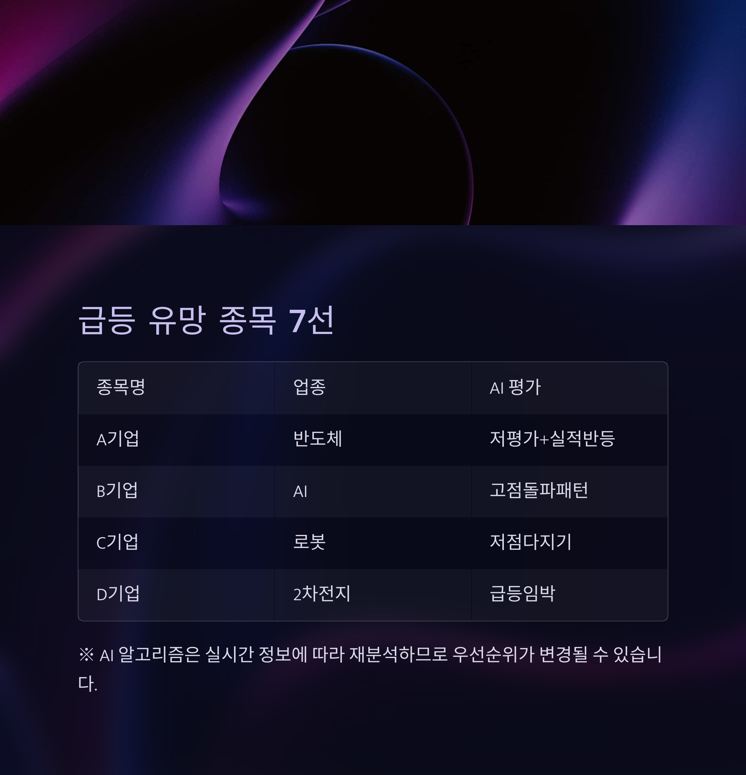 이번 분석에서는 인공지능 알고리즘이 시장 데이터를 기반으로 선정한 급등 가능성이 높은 유망 종목 7개를