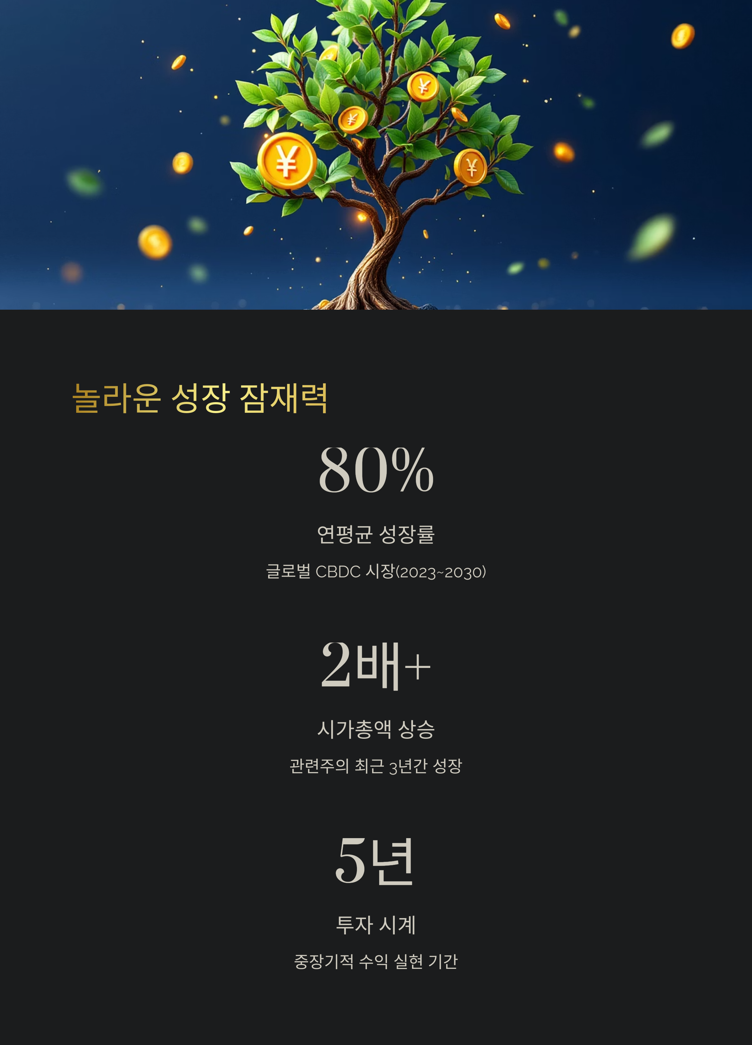 CBDC는 중앙은행이 직접 발행하고 관리하는 디지털 화폐로, 현재의 종이화폐 또는 기존 전자결제 시스템과는 차원이 다른 금융 인프라를 의미합니다. 이미 중국, 유럽, 한국 등 다양한 국가에서 시범 도입이 진행 중이며, 그에 따른 기술 수요 증가가 예상됩니다. 특히 빠르고 안전한 전송 시스템, 개인정보 보호, 실시간 모니터링이 가능한 핀테크 기술이 핵심이 됩니다.