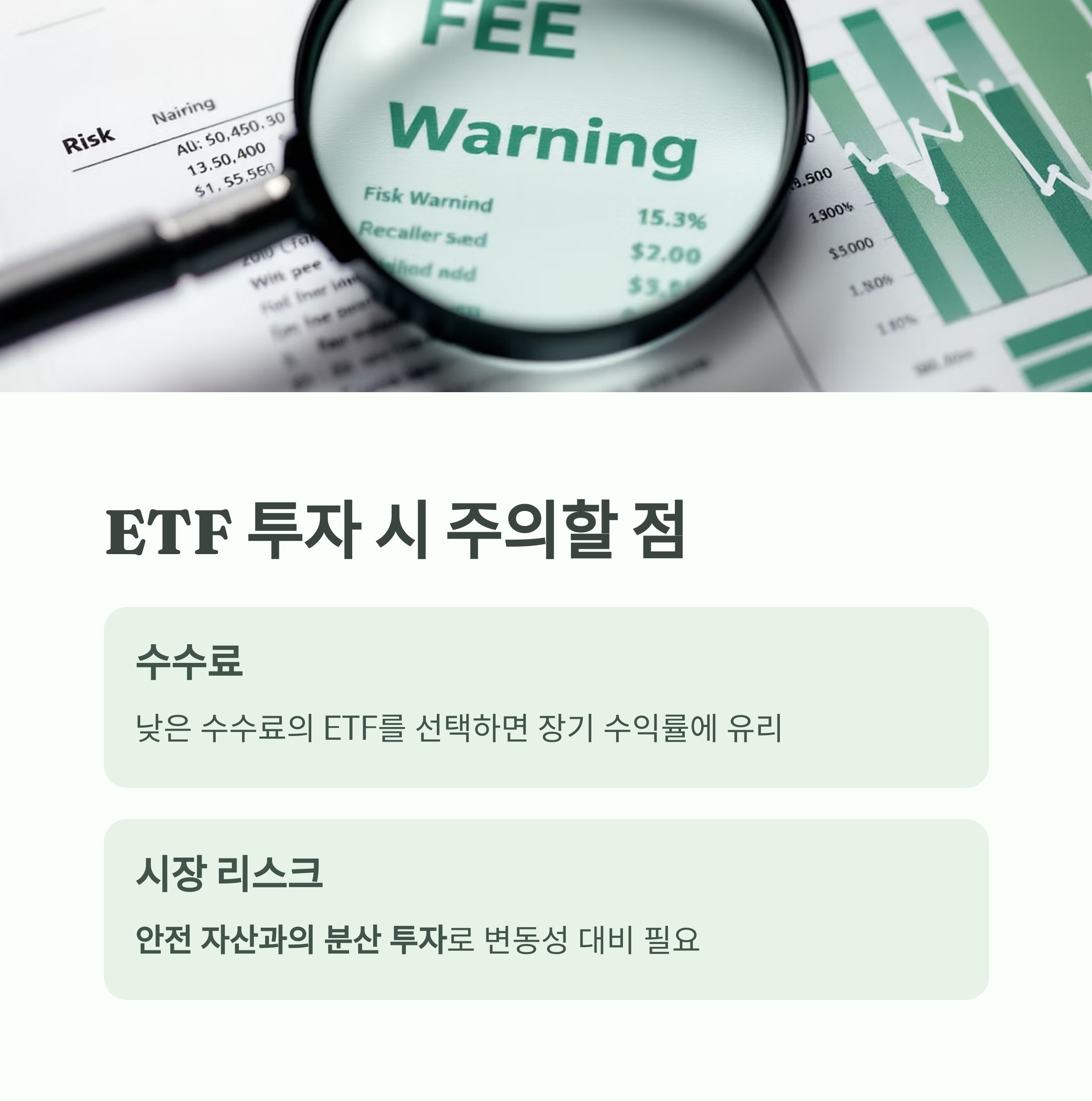 ETF마다 보수와 거래 수수료가 다릅니다. 낮은 수수료의 ETF를 선택하는 것이 수익률에 큰 영향을 줍니다. - 시장 리스크: