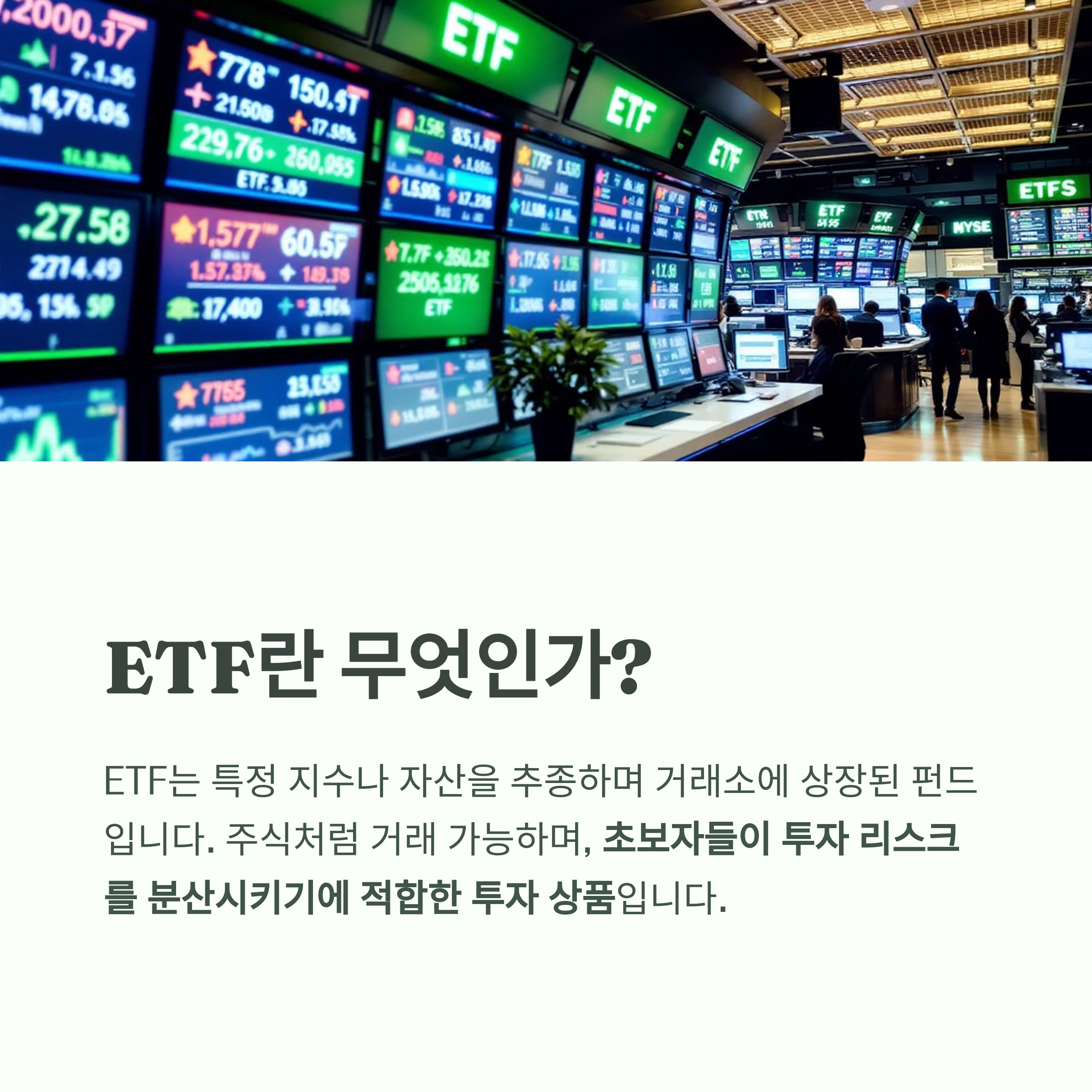 ETF는 주식, 채권, 원자재, 해외지수 등 다양한 자산에 투자할 수 있어 초보자들이 투자 리스크를 분산시키기에 적합한 투자 상품입니다.