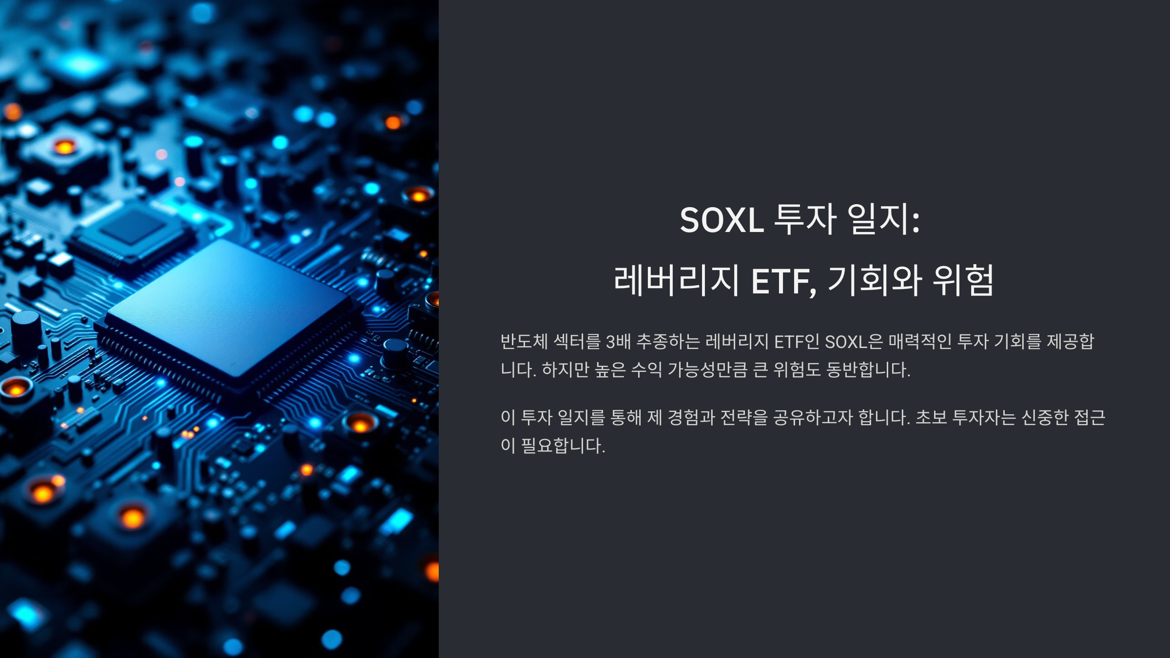 최근 주식 시장에서 레버리지 ETF에 대한 관심이 다시금 높아지고 있습니다. 특히 SOXL은 반도체 업종에 3배 수익률을 추종하는 대표적인 ETF로, 투자자들 사이에서 꾸준한 인기를 끌고 있는데요. 하지만 고수익만큼 위험성도 높은 상품이기 때문에 신중한 접근이 필요한 것이 사실입니다. 저 역시 지난 몇 달간 SOXL 투자 일기를 써오며 느꼈던 점들을 정리해보았습니다. 최근의 시장 흐름과 더불어 현재 추가 매수에 대한 고민을 하고 있는 분들에게 실질적인 인사이트가 되길 바랍니다. 본 포스팅은 투자 권유가 아니며, 개인적인 경험을 바탕으로 작성한 내용임을 밝힙니다. 투자 판단은 반드시 스스로의 분석과 기준에 따라 이뤄져야 하며, 충분한 사전 조사가 수반되어야 합니다.
