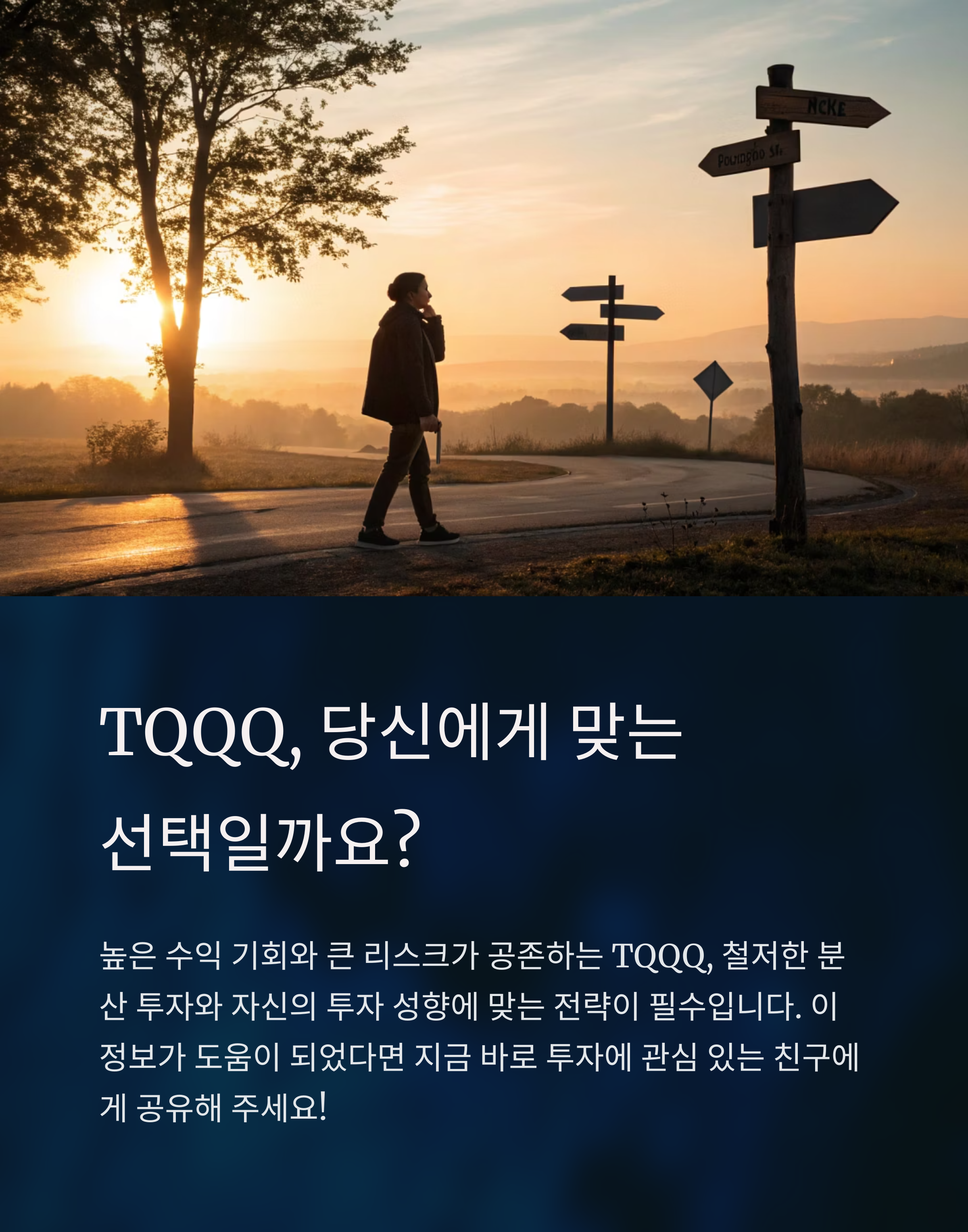 TQQQ는 고수익을 추구하는 투자자들에게 강력한 매력을 지닌 상품입니다. 과거 10년간의 수익률만 보더라도 충분한 잠재력을 보여줬지만, 이는 단순히 상승장만 고려한 결과일 수 있습니다. 앞으로의 투자에서도 변동성과 리스크 관리를 우선시해야 하며, 나만의 투자 원칙과 심리적 여유가 중요합니다. 매 순간 시장에 흔들리지 않고, 장기적인 시각에서 접근한다면 TQQQ는 여전히 우리의 자산 증식에 긍정적인 영향을 줄 수 있습니다. 하지만 모든 결정은 신중하게, 충분한 정보와 분석을 바탕으로 이루어져야 합니다.